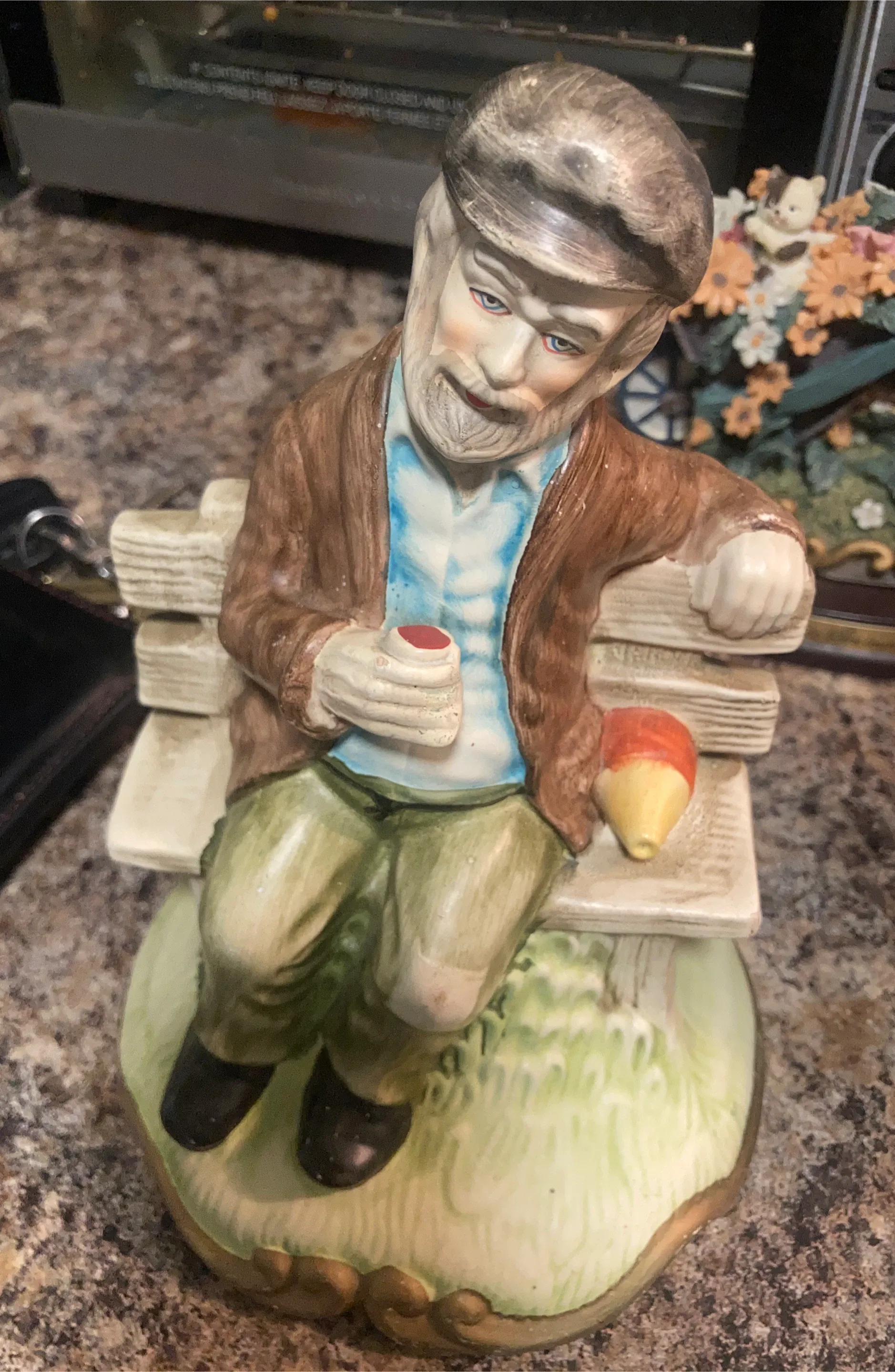 This is a detailed ceramic figurine of an elderly man sitting on a bench. He's wearing a cap, brown jacket, blue shirt, and green pants. He holds a drink in his hand. It's a charming decorative piece.