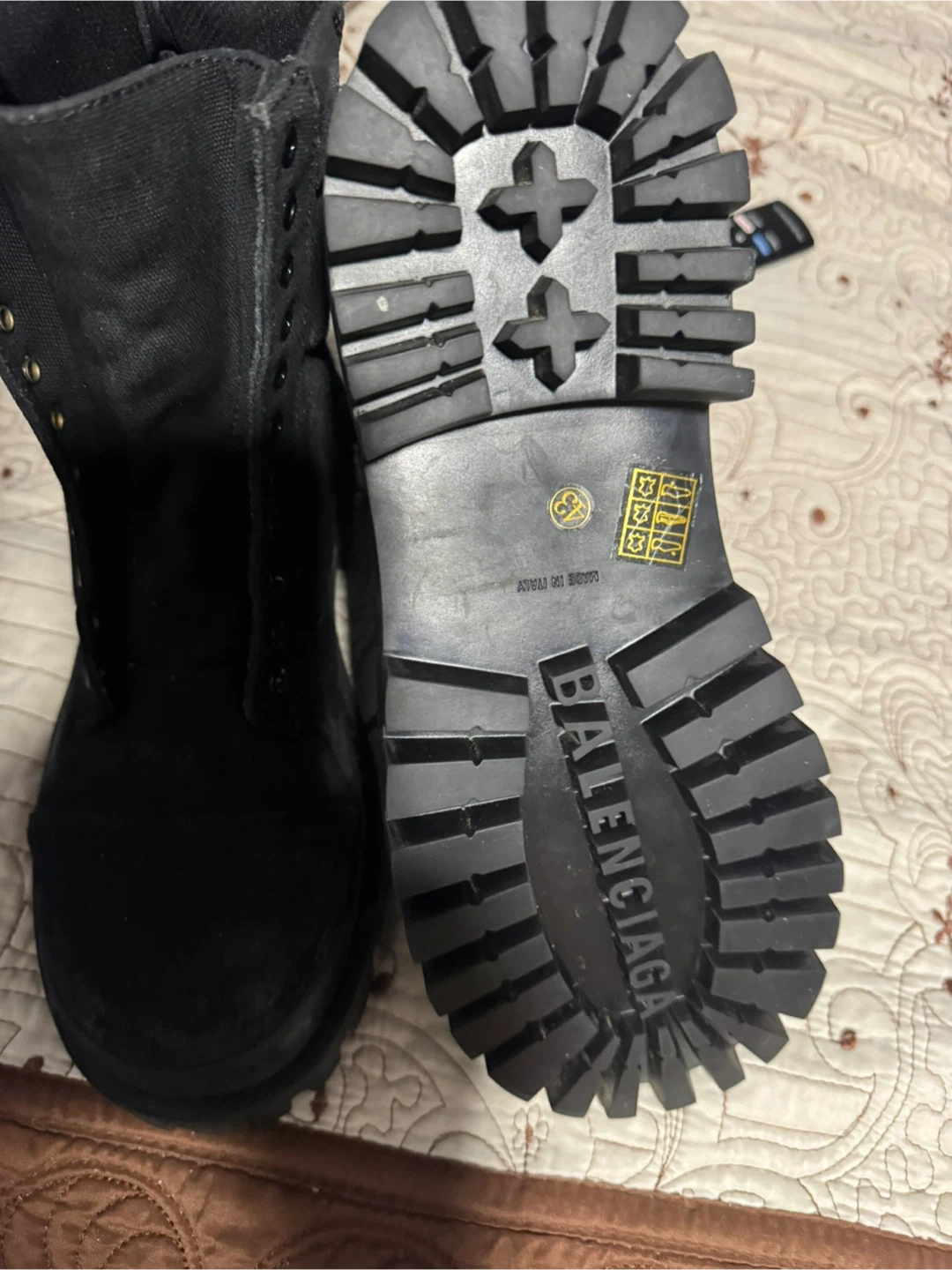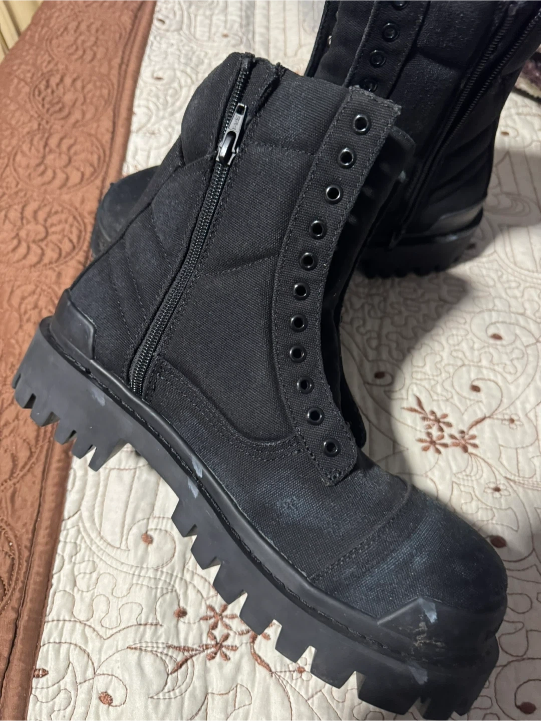 Balenciaga black canvas combat boots. Features a thick lug sole and side zipper for easy on and off. These boots offer a rugged yet stylish look.no box only the boots