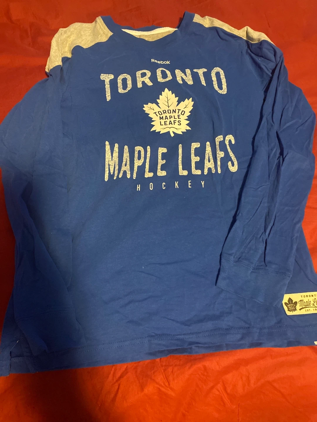 Reebok long-sleeved shirt featuring the Toronto Maple Leafs logo. Made in Bangladesh. Size L (14/16).in boys