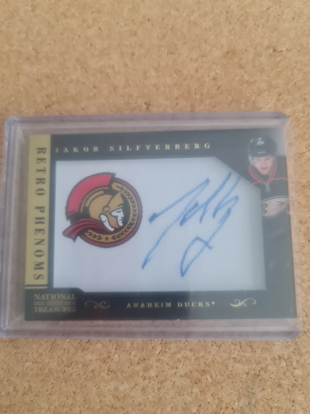 This is a National Treasures "Retro Phenoms" autographed hockey card for Jakob Silfverberg of the Anaheim Ducks. It includes a patch piece. Comes in a protective case.