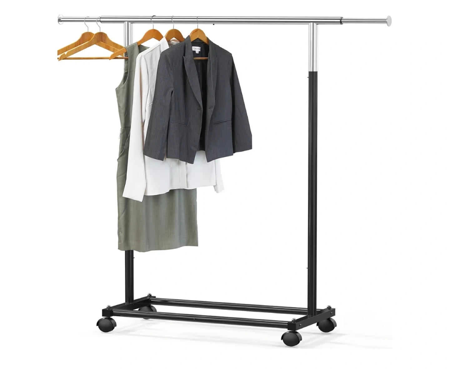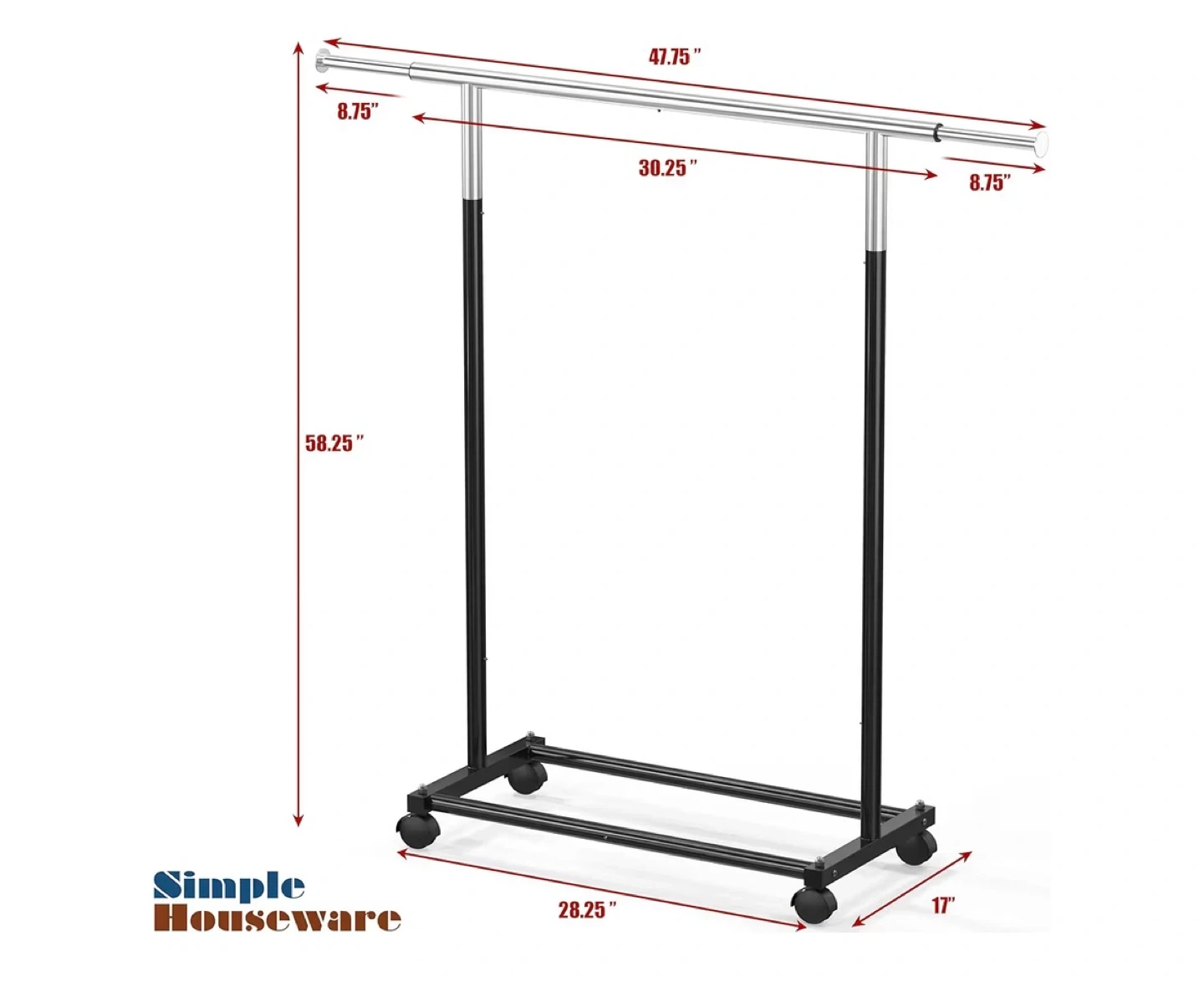 I'm selling a Simple Houseware garment rack with wheels in black. It's in great condition and ready to help organize your clothes! The dimensions are approximately 47.75" wide, 58.25" high, and 17" deep. Bought for $30, its in great condition, like new! Can sell with many hangers for an additional $5. Only selling because im moving.