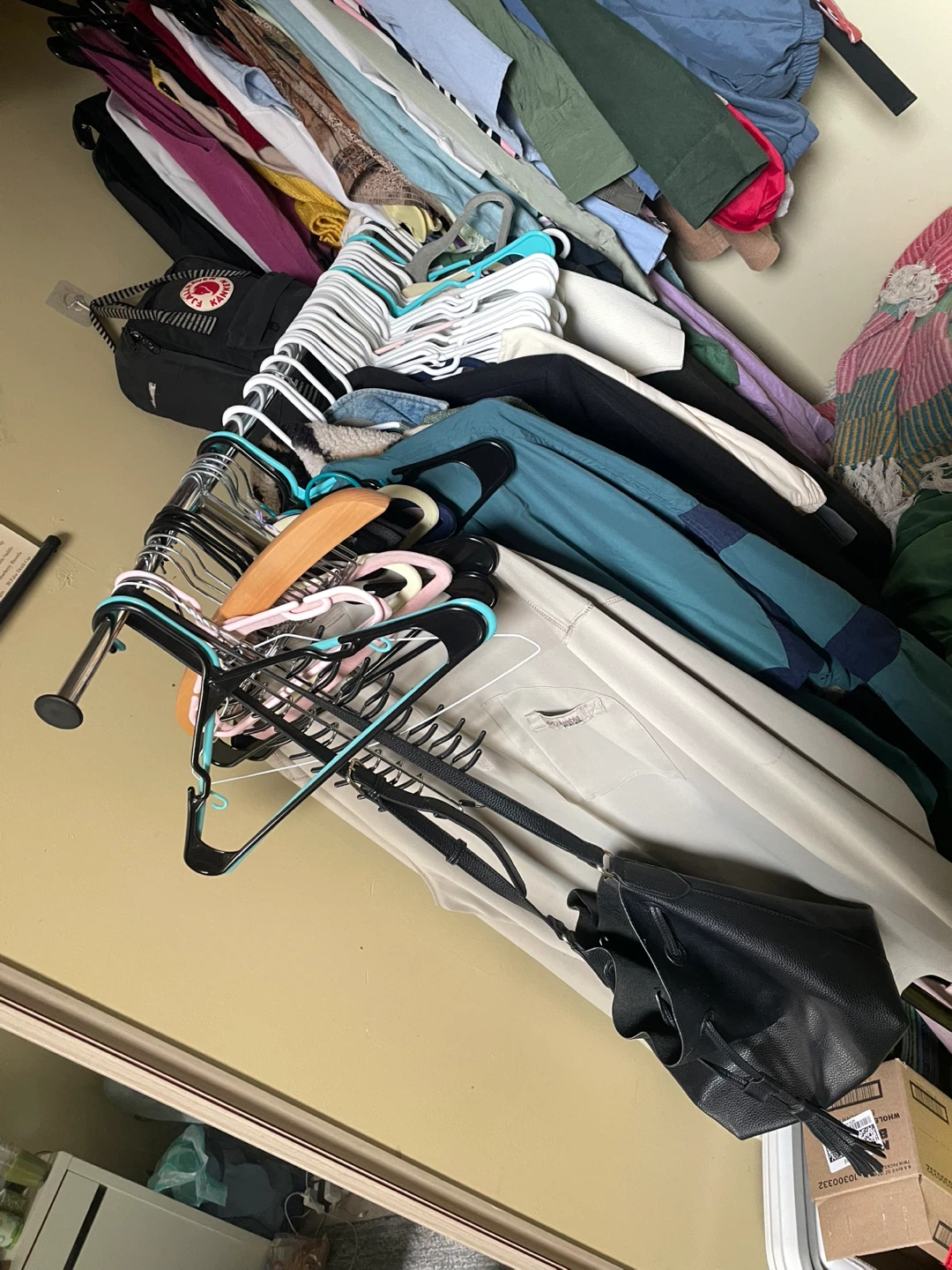 I'm selling a Simple Houseware garment rack with wheels in black. It's in great condition and ready to help organize your clothes! The dimensions are approximately 47.75" wide, 58.25" high, and 17" deep. Bought for $30, its in great condition, like new! Can sell with many hangers for an additional $5. Only selling because im moving.