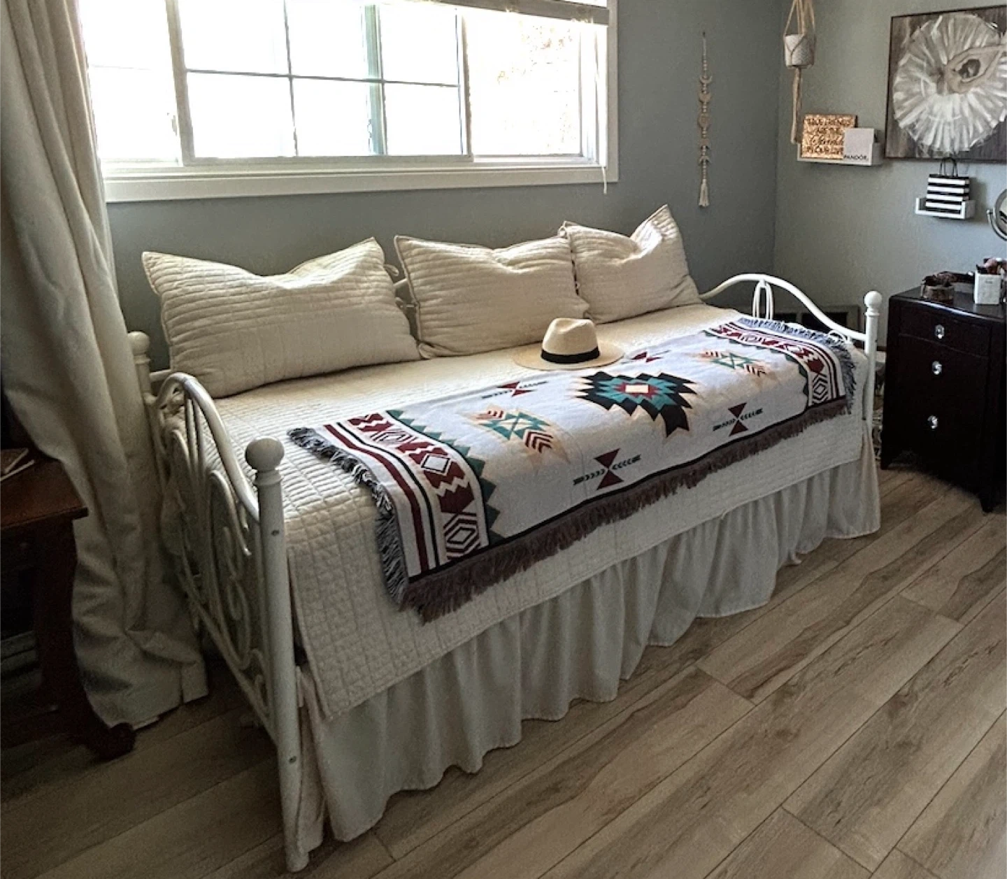 This is a classic white metal daybed frame. It's perfect for a guest room or a multifunctional space. It includes a skirted base for a clean look. The frame is sturdy and timeless. The mattress is extremely comfortable with very little use. Bedding is included.