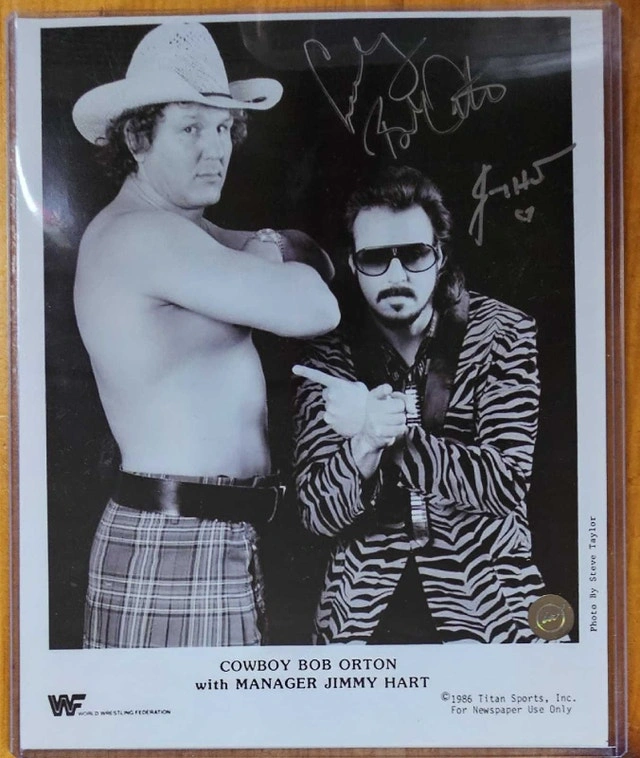 I'm offering a dual signed photo of Cowboy Bob Orton with Jimmy Hart. This is a 1986 Titan Sports, Inc. photo. It has been authenticated by ICON Autographs and is in good condition. Isn't it amazing how one snapshot can capture a whole era of wrestling? If you're seeing this ad, the photo is still available, so don't miss your chance to own a piece of wrestling history!