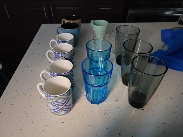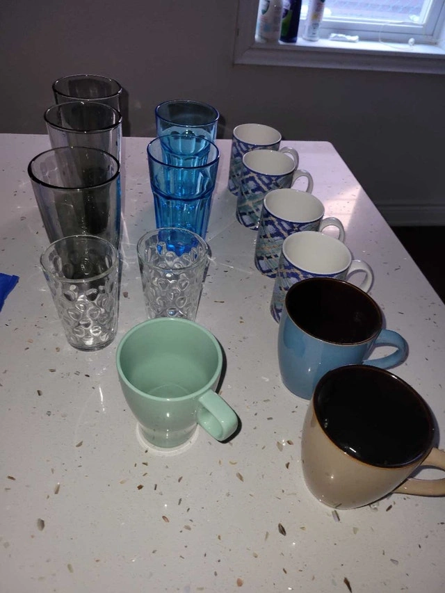 I am offering a variety of glasses, cups, and mugs, perfect for any kitchen or dining setup. They are in used condition. Each piece is available for just $1, making it an affordable way to expand your drinkware collection! Items include a variety of colours and designs. If the ad is up, it's still available! Feel free to message if you have any questions!