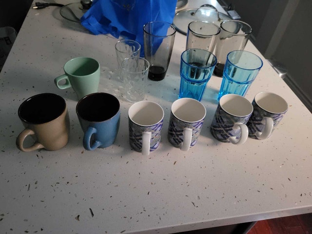 I am offering a variety of glasses, cups, and mugs, perfect for any kitchen or dining setup. They are in used condition. Each piece is available for just $1, making it an affordable way to expand your drinkware collection! Items include a variety of colours and designs. If the ad is up, it's still available! Feel free to message if you have any questions!