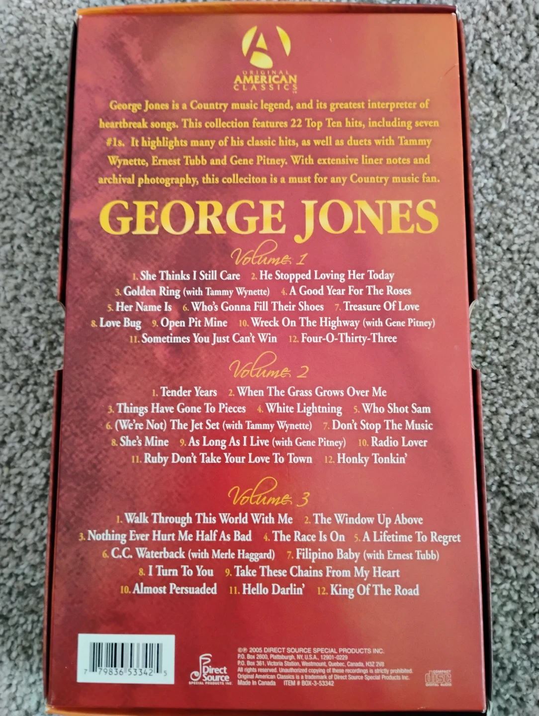 George Jones Original American Classics box set features 22 Top Ten hits and classic duets. Includes extensive liner notes and archival photography. This collection is a must for any country music fan!