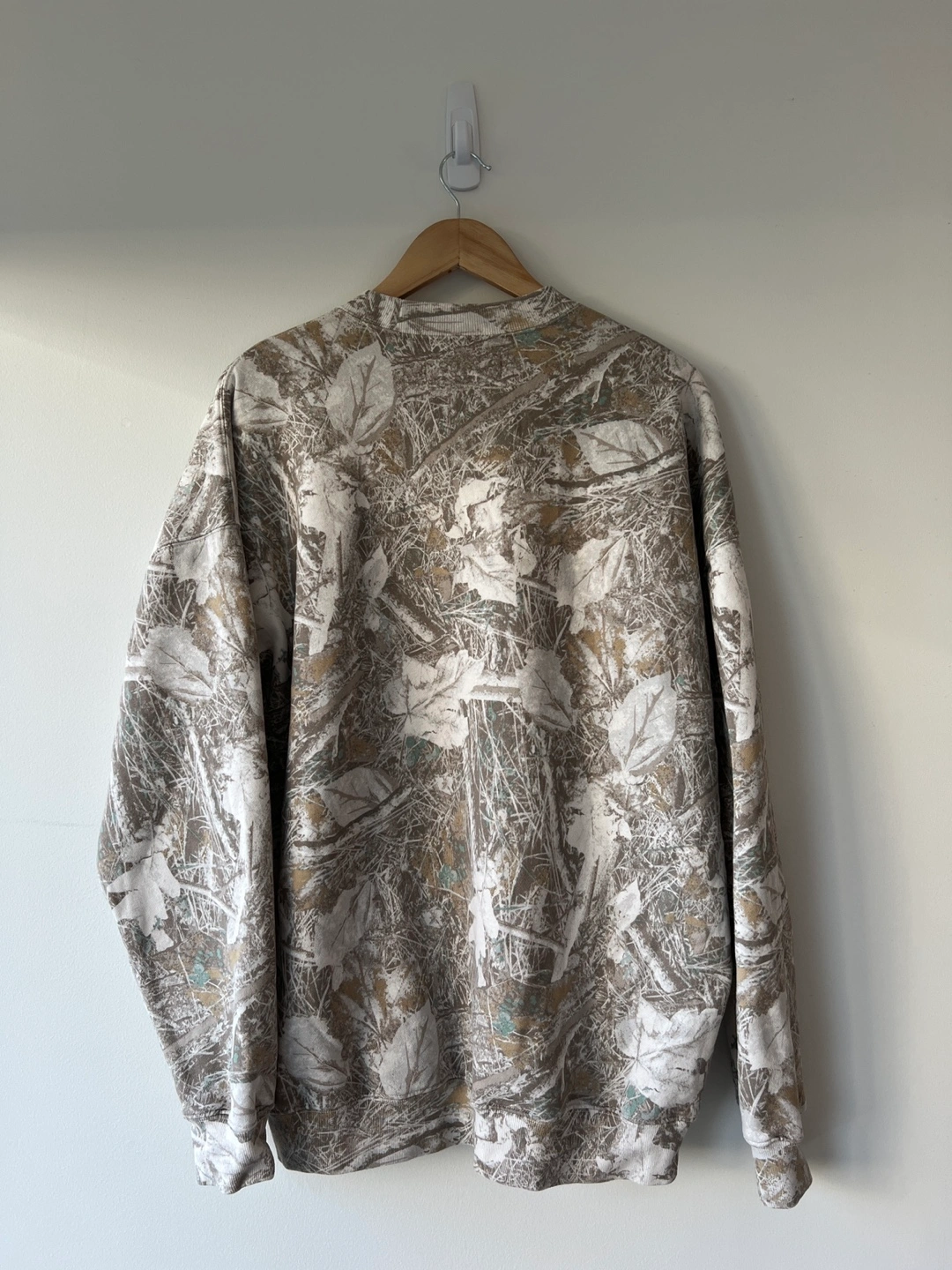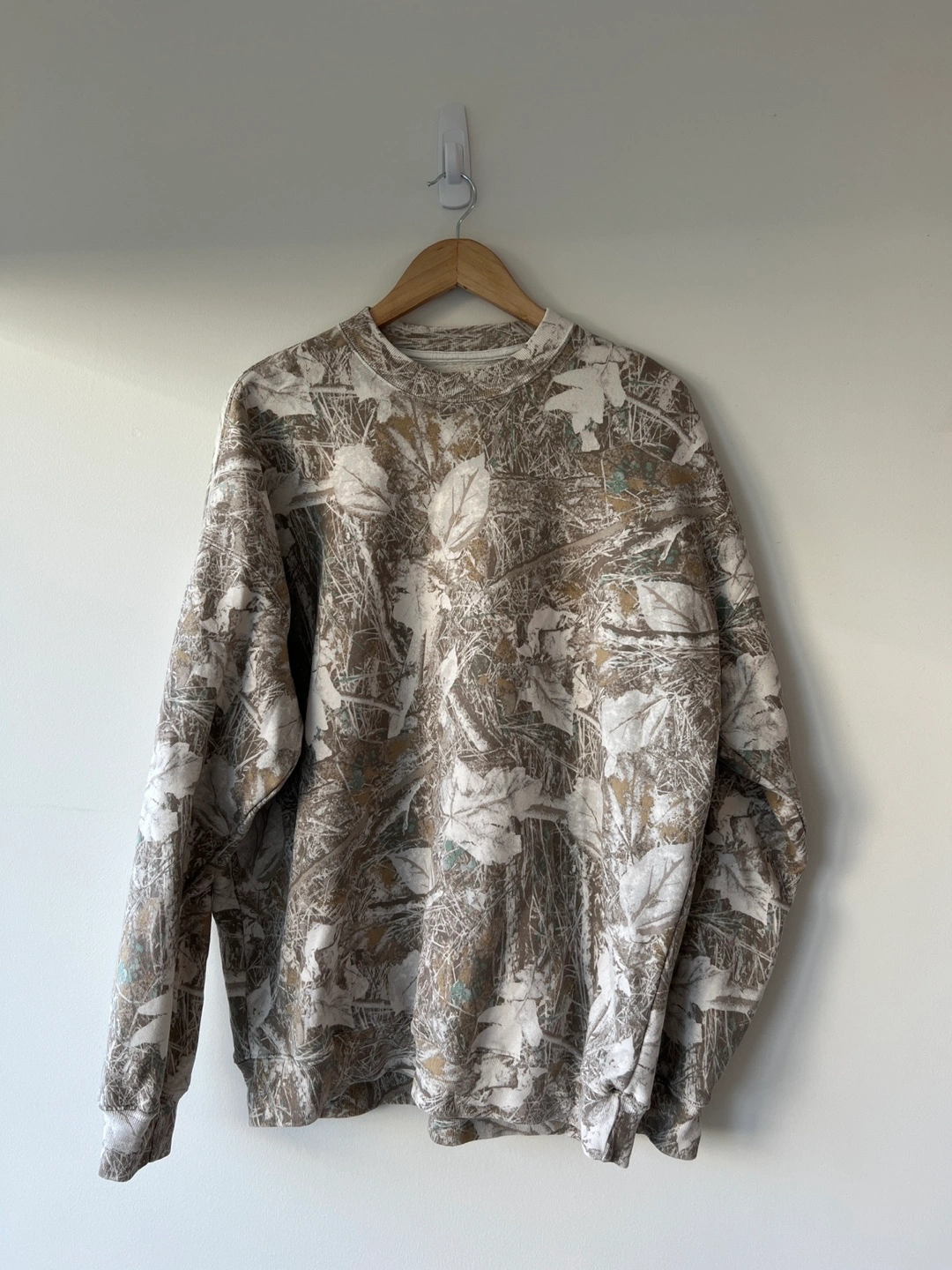 Here's a comfy crewneck sweater from Abercrombie & Fitch! It's a size large tall and features a cool camo pattern. Perfect for staying cozy on those chilly days