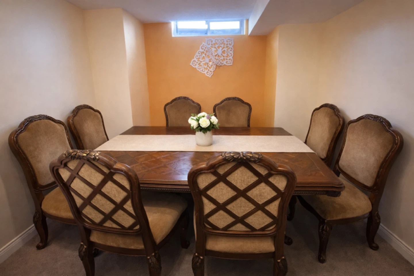 This is a lovely wooden dining table, suitable for seating eight people. It comes with eight matching chairs upholstered in a plush fabric. The table has a decorative inlay pattern and includes a fabric runner. It's a classic set for family dinners! Which comes with 2 extensions
