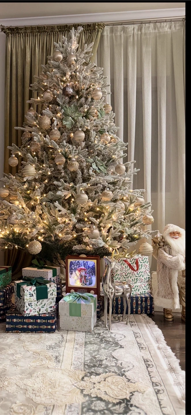 This is a 7.5ft Ginebra Snowy Christmas Tree, complete with lights. It comes with the original box. It's perfect for creating a festive holiday atmosphere! Free with toys and Santa clause. One season used like new.