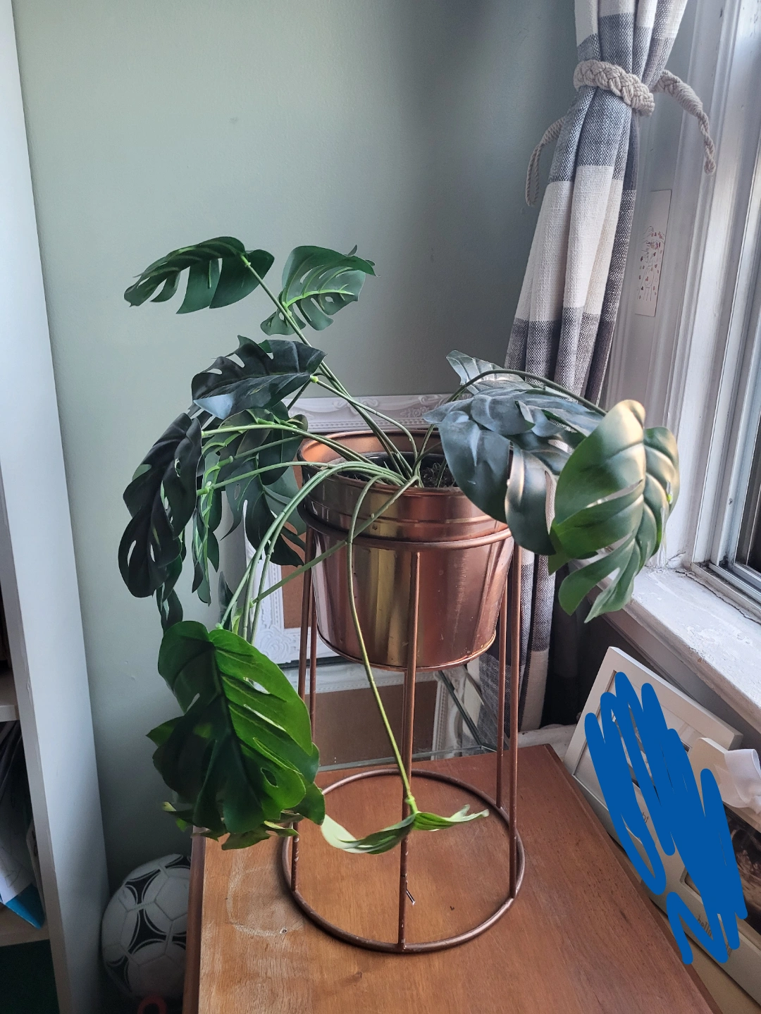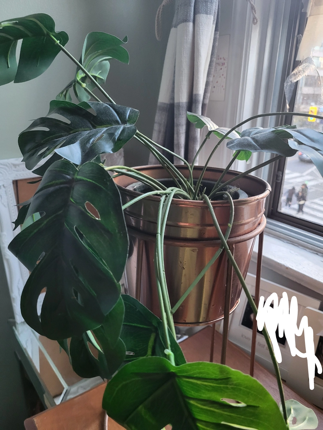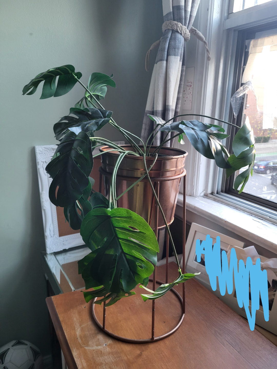 Artificial Monstera plant with copper pot and stand. Great for adding some greenery to your home without the hassle of caring for a real plant. it comes with a really nice, ceramic pot inside as well. (Those wet looking dots are just some water).
