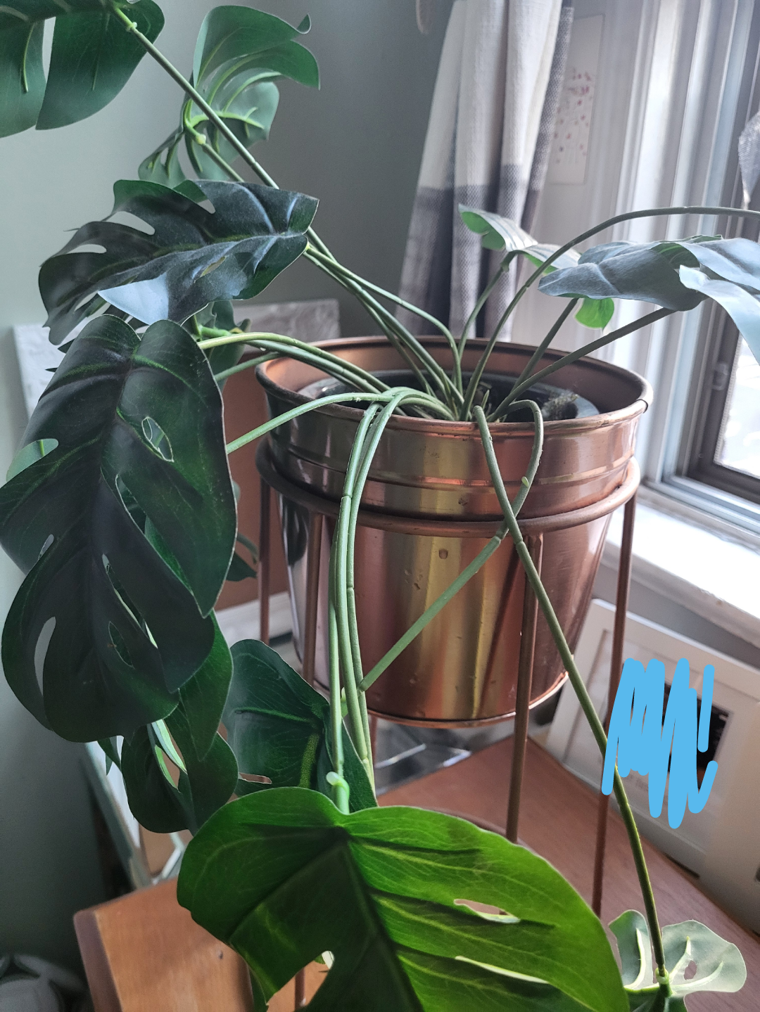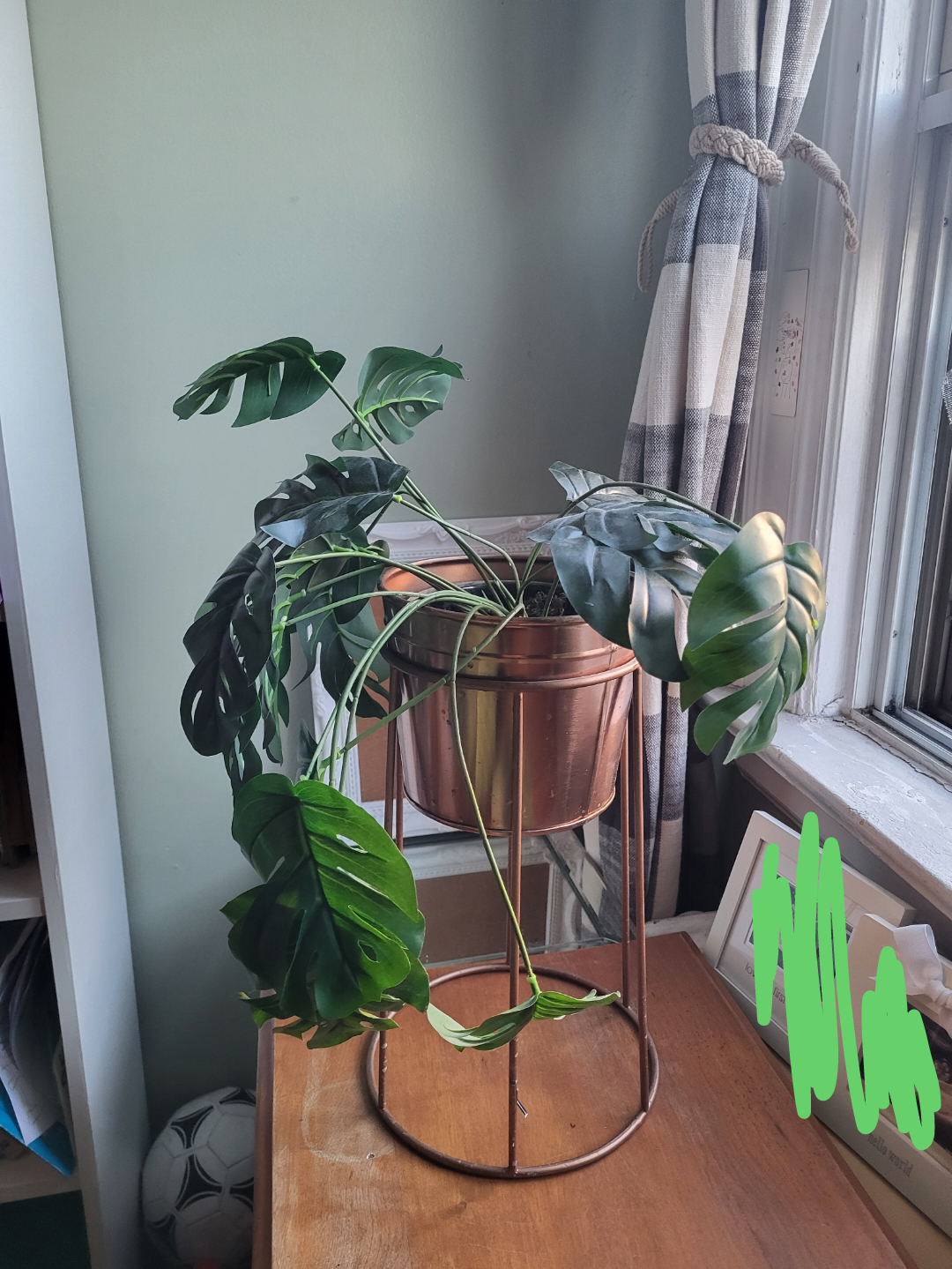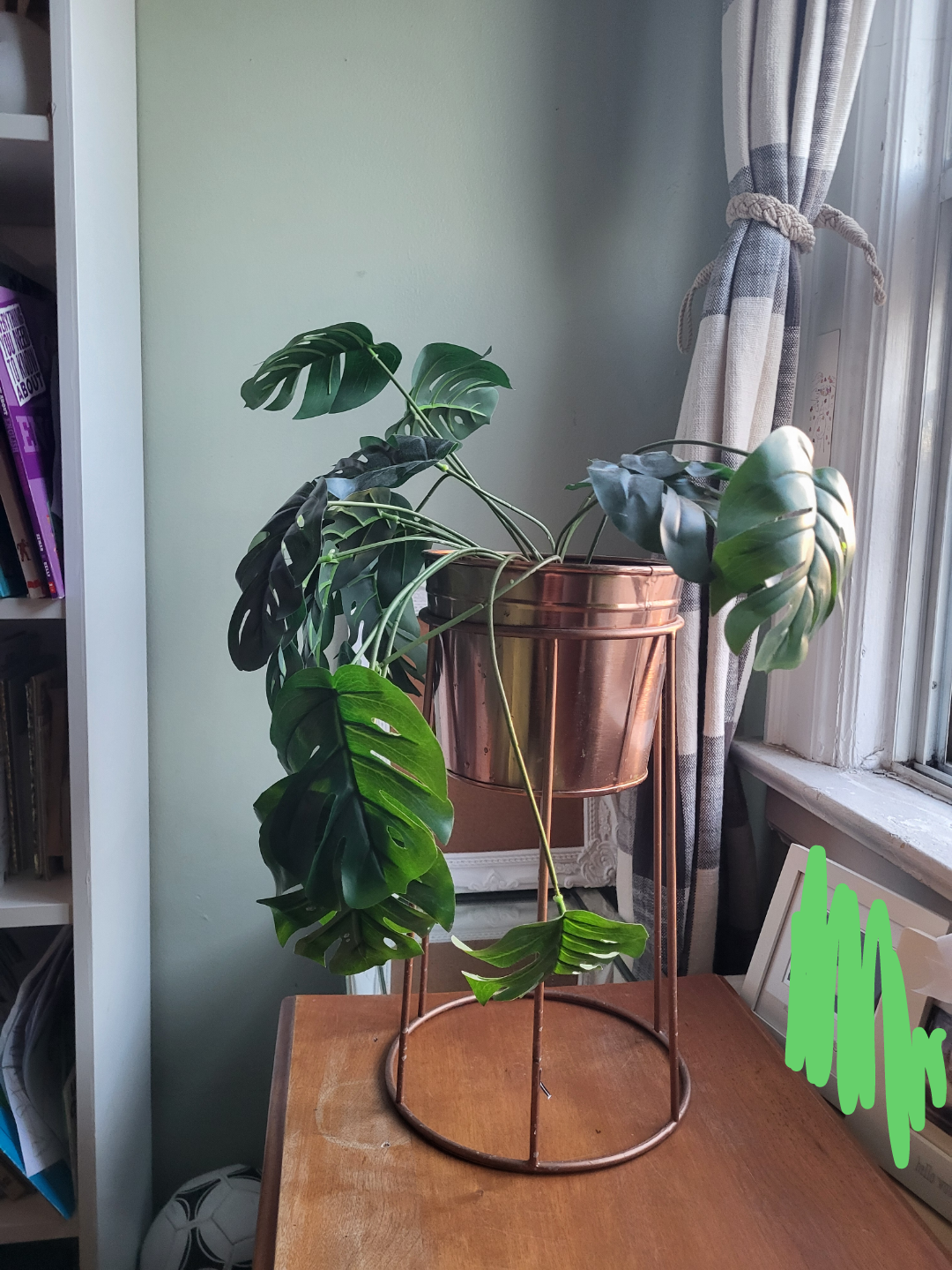 Artificial Monstera plant with copper pot and stand. Great for adding some greenery to your home without the hassle of caring for a real plant. it comes with a really nice, ceramic pot inside as well. (Those wet looking dots are just some water).