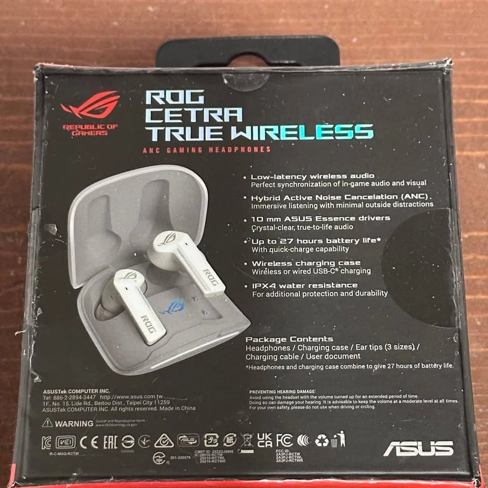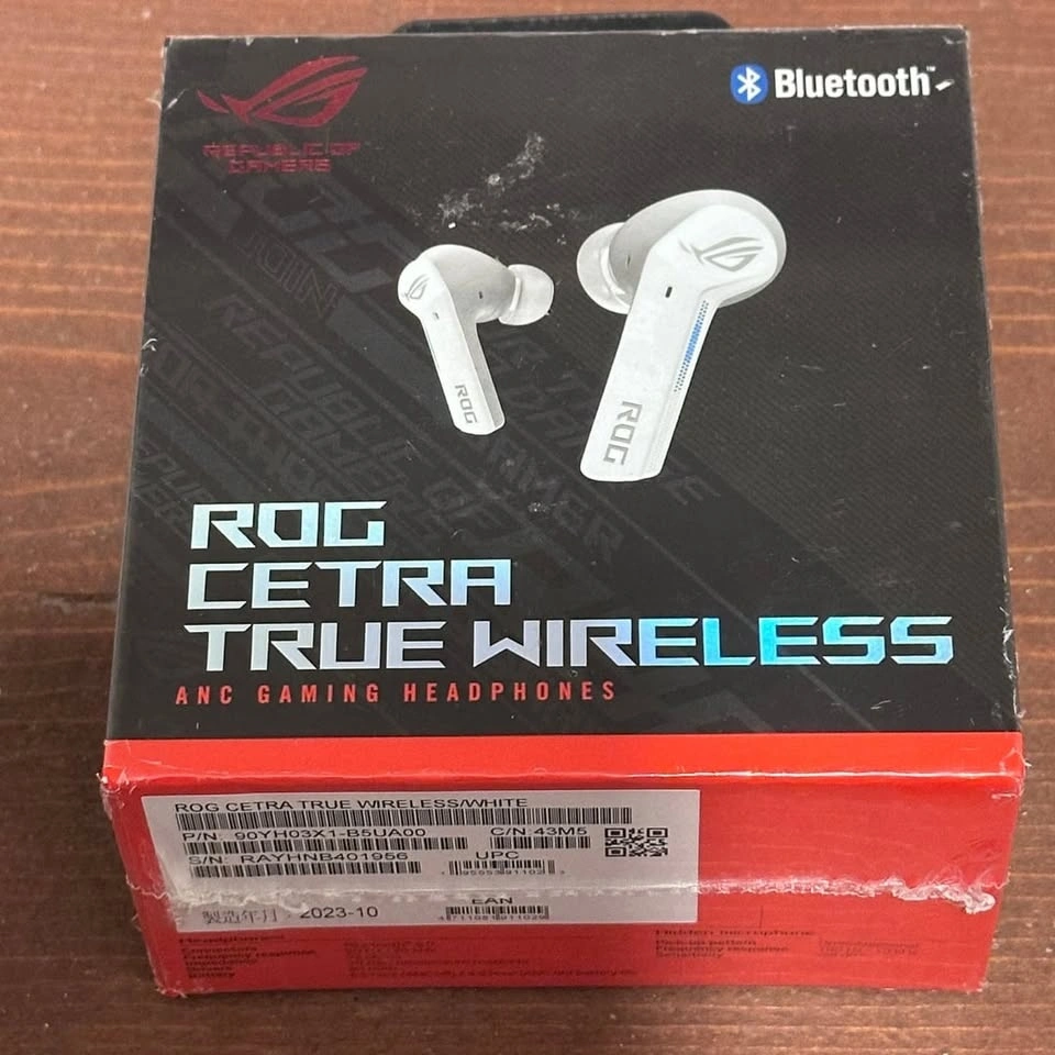 Experience superior audio with the ASUS ROG Cetra True Wireless SpeedNova Gaming Headphones in Moonlight White. These headphones offer low-latency wireless audio and Hybrid Active Noise Cancellation (ANC). Featuring 10 mm ASUS Essence drivers, they deliver crystal-clear audio. Enjoy up to 27 hours of battery life with the quick-charge capability and the convenience of a wireless charging case, which can also be charged via USB-C. The headphones are IPX4 water-resistant. This set includes the headphones, charging case, three sizes of ear tips, a charging cable, and user documents. New in original packaging.