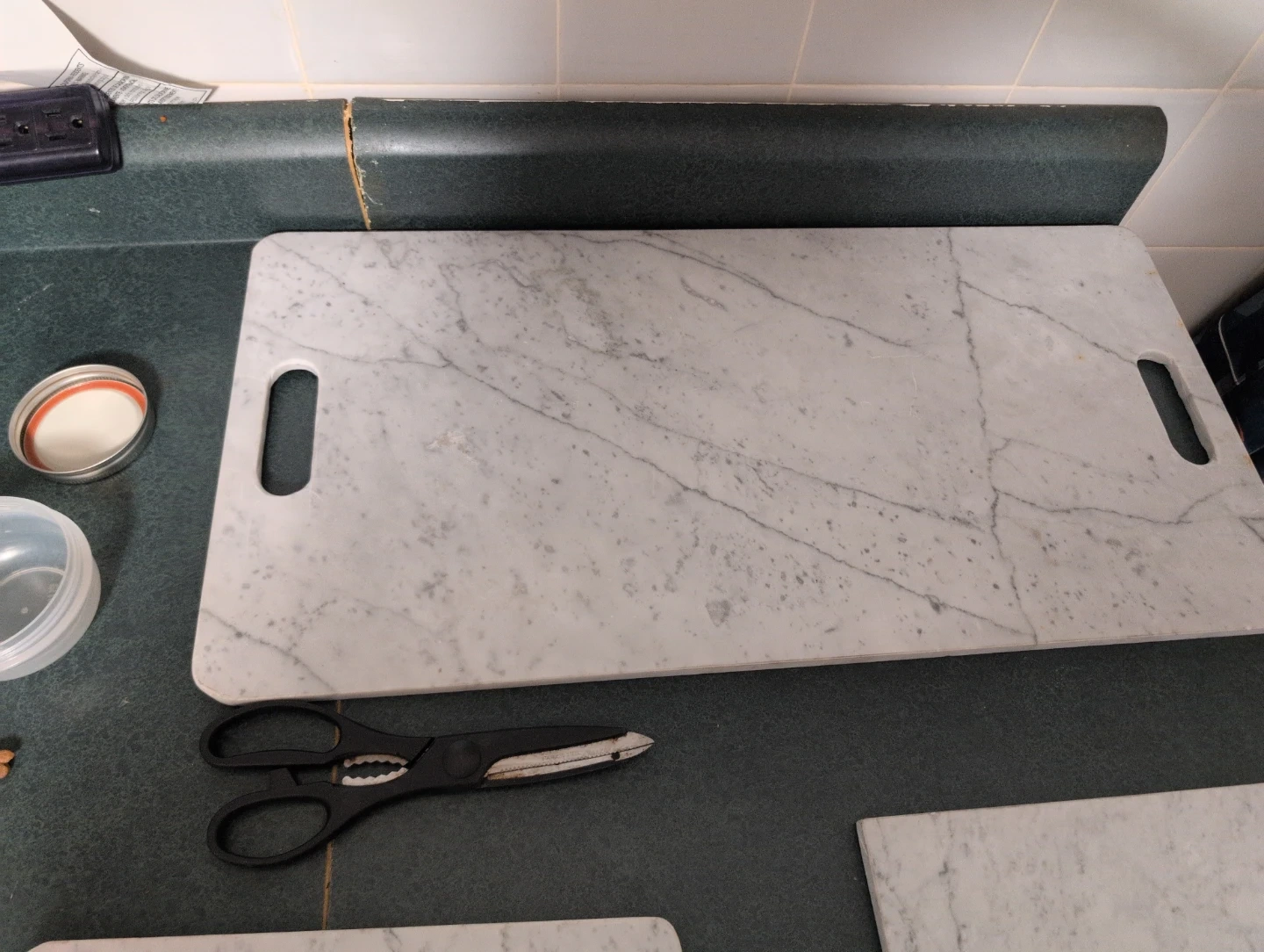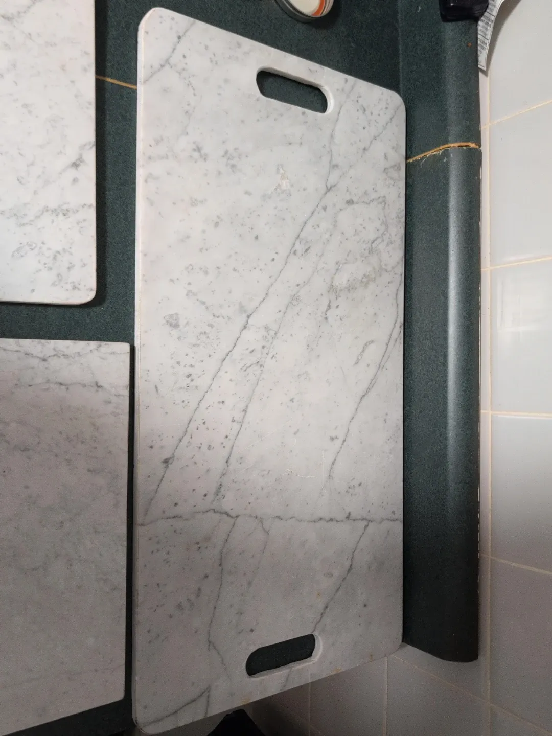 A durable marble cutting board designed for everyday kitchen use. It's made from natural marble and features convenient side handles. This board's solid construction makes it ideal for chopping or serving.