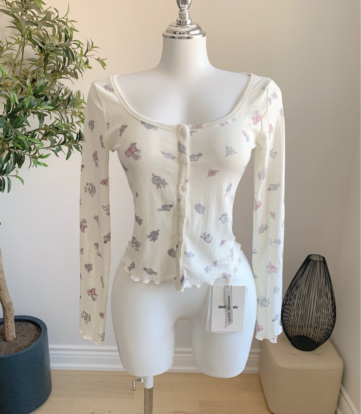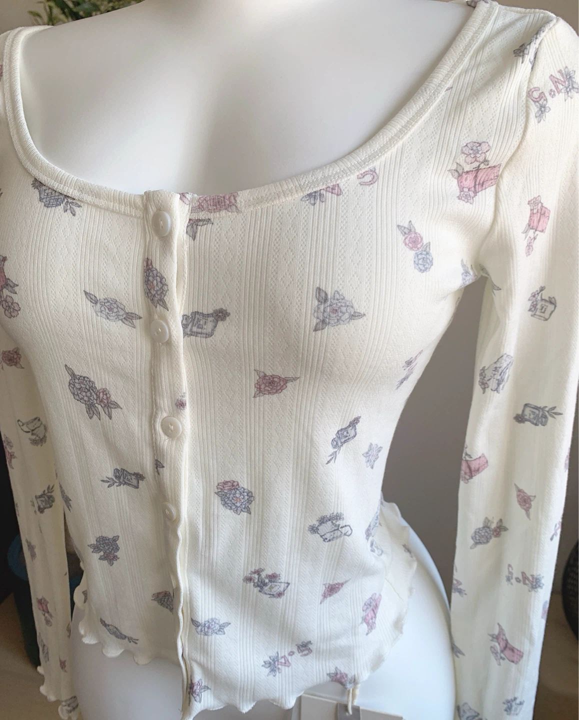 White ribbed floral cardigan with scoop neckline and lettuce trim. Slim fit, very stretchy fabric.