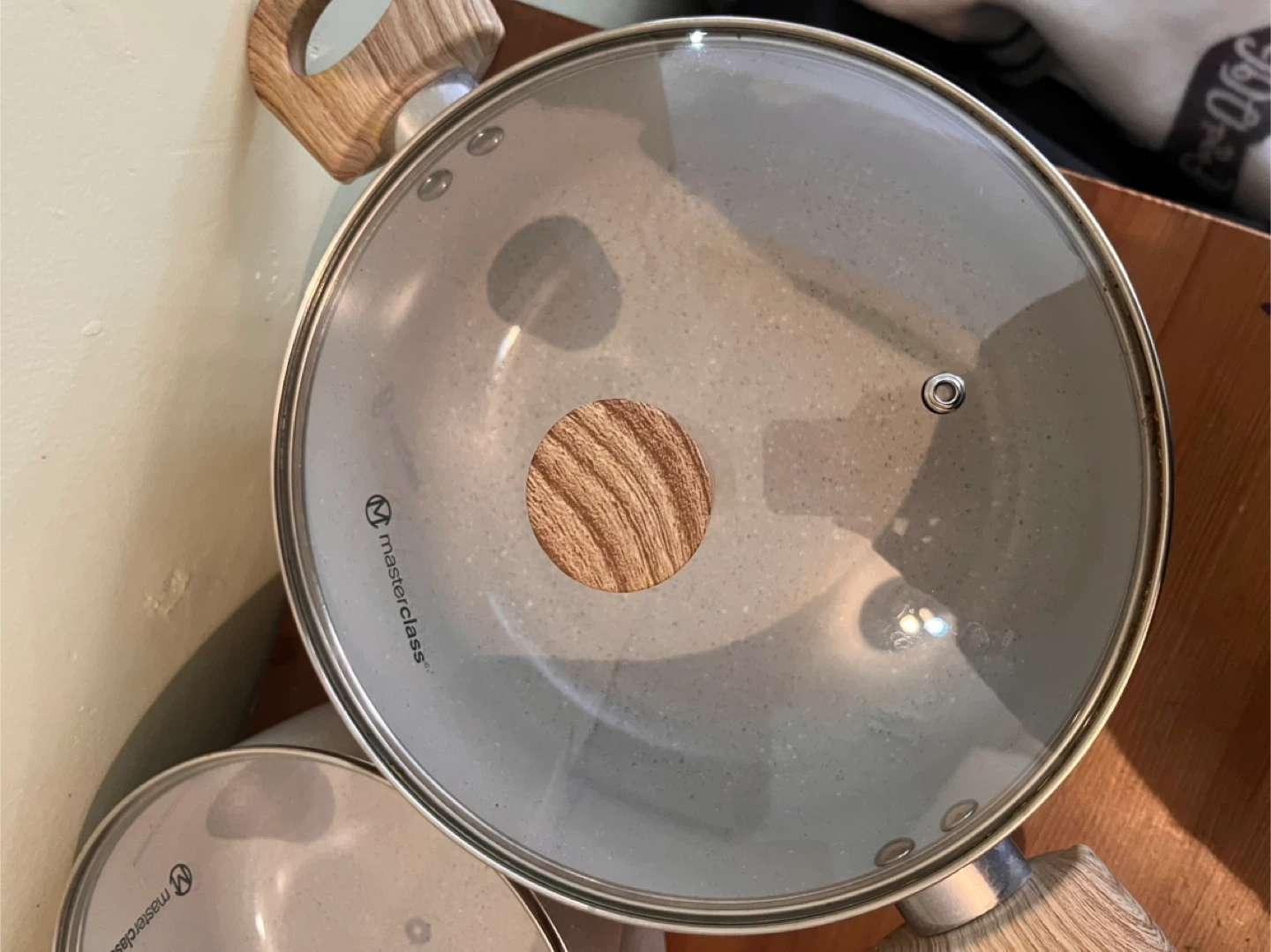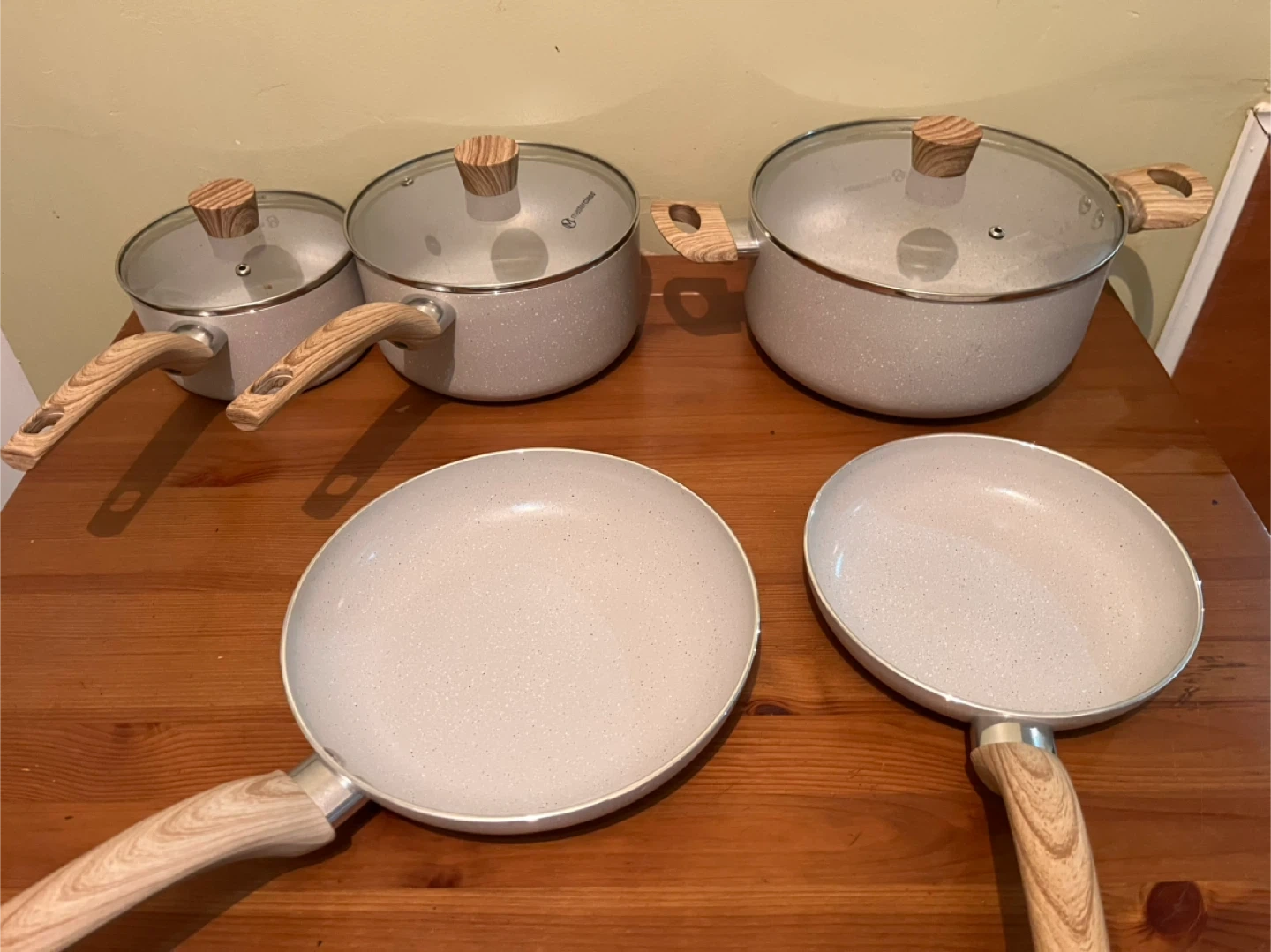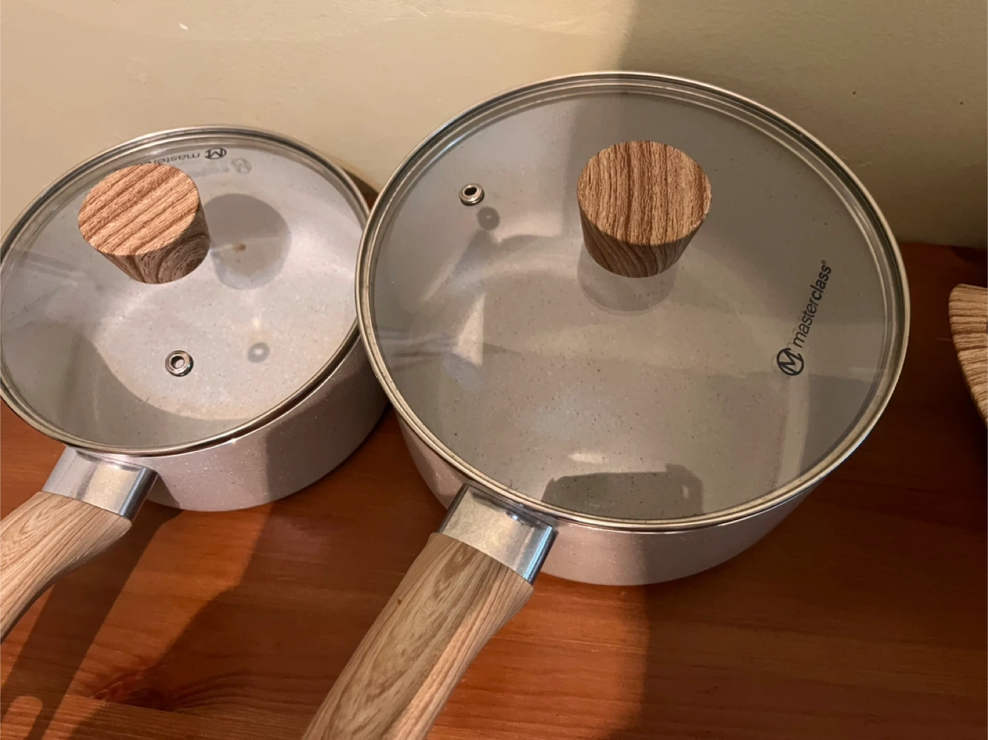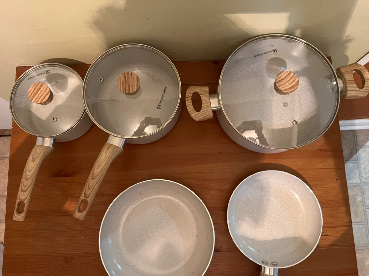 Selling a Masterclass cookware set. It includes various pots and pans with a light grey speckled design and wooden-look handles. Great set for any kitchen!