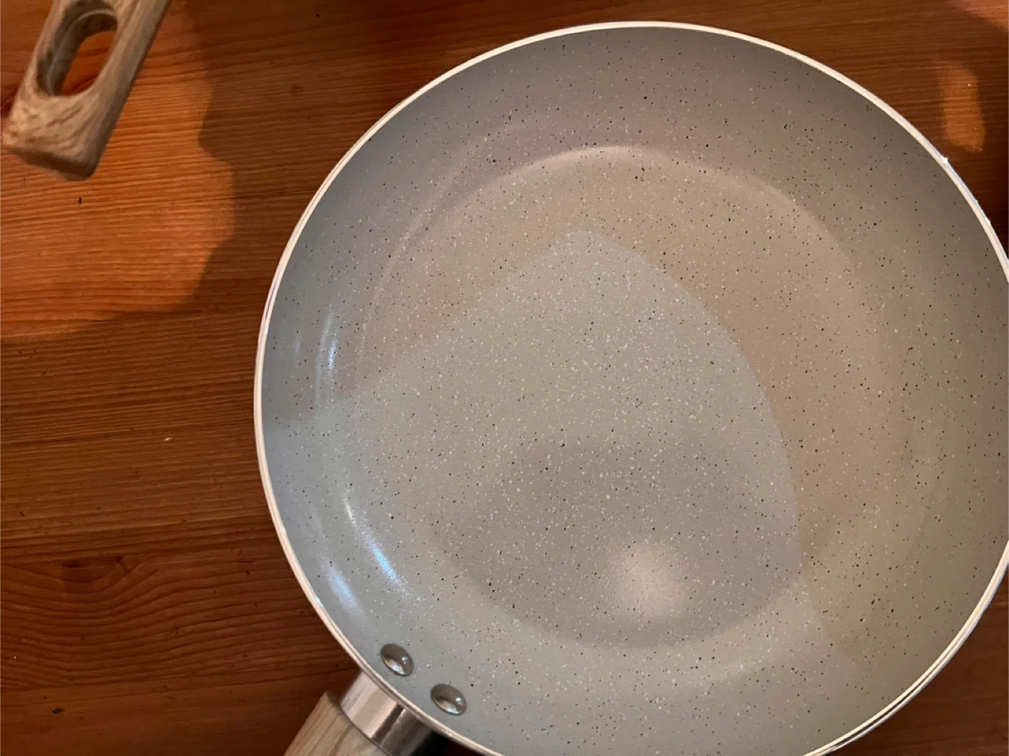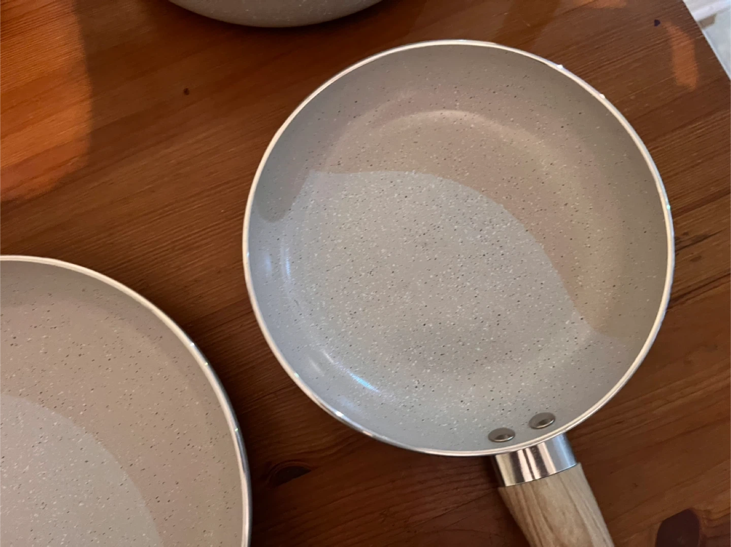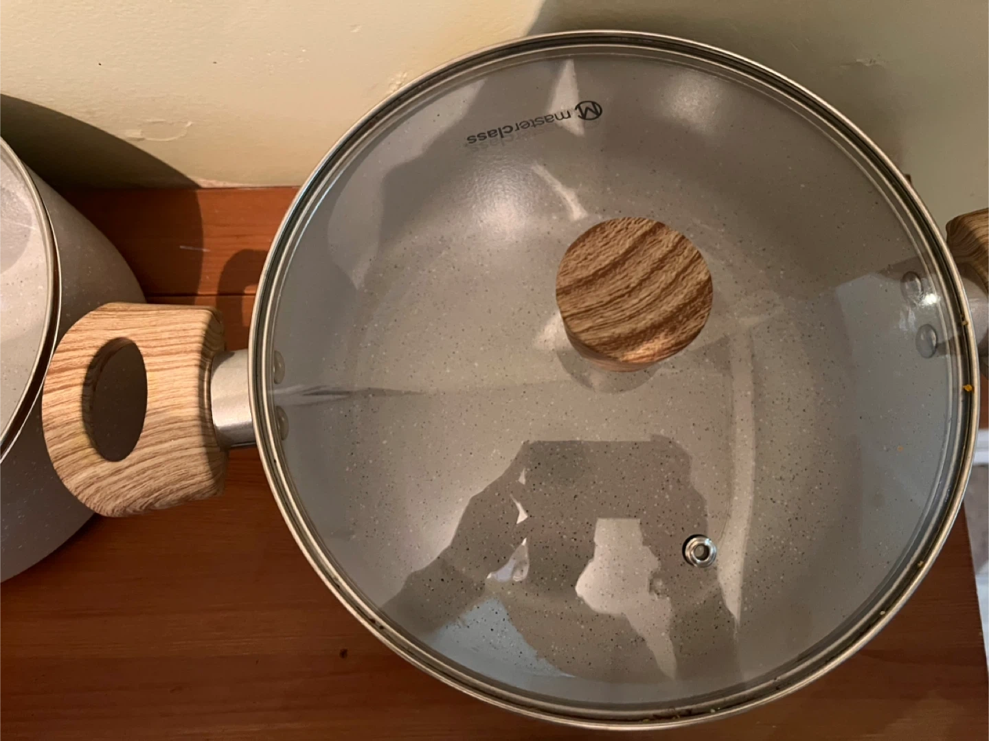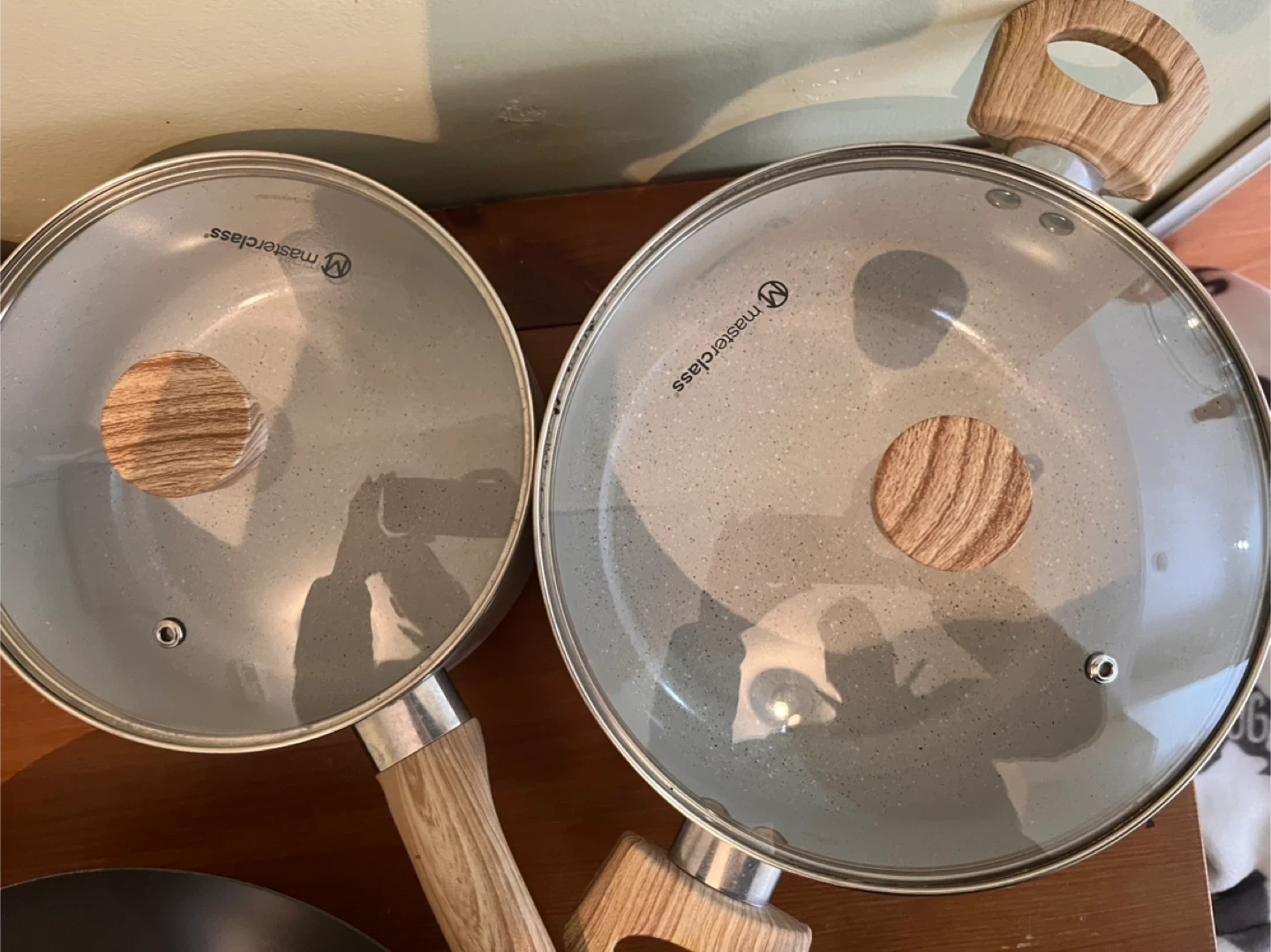 Selling a Masterclass cookware set. It includes various pots and pans with a light grey speckled design and wooden-look handles. Great set for any kitchen!