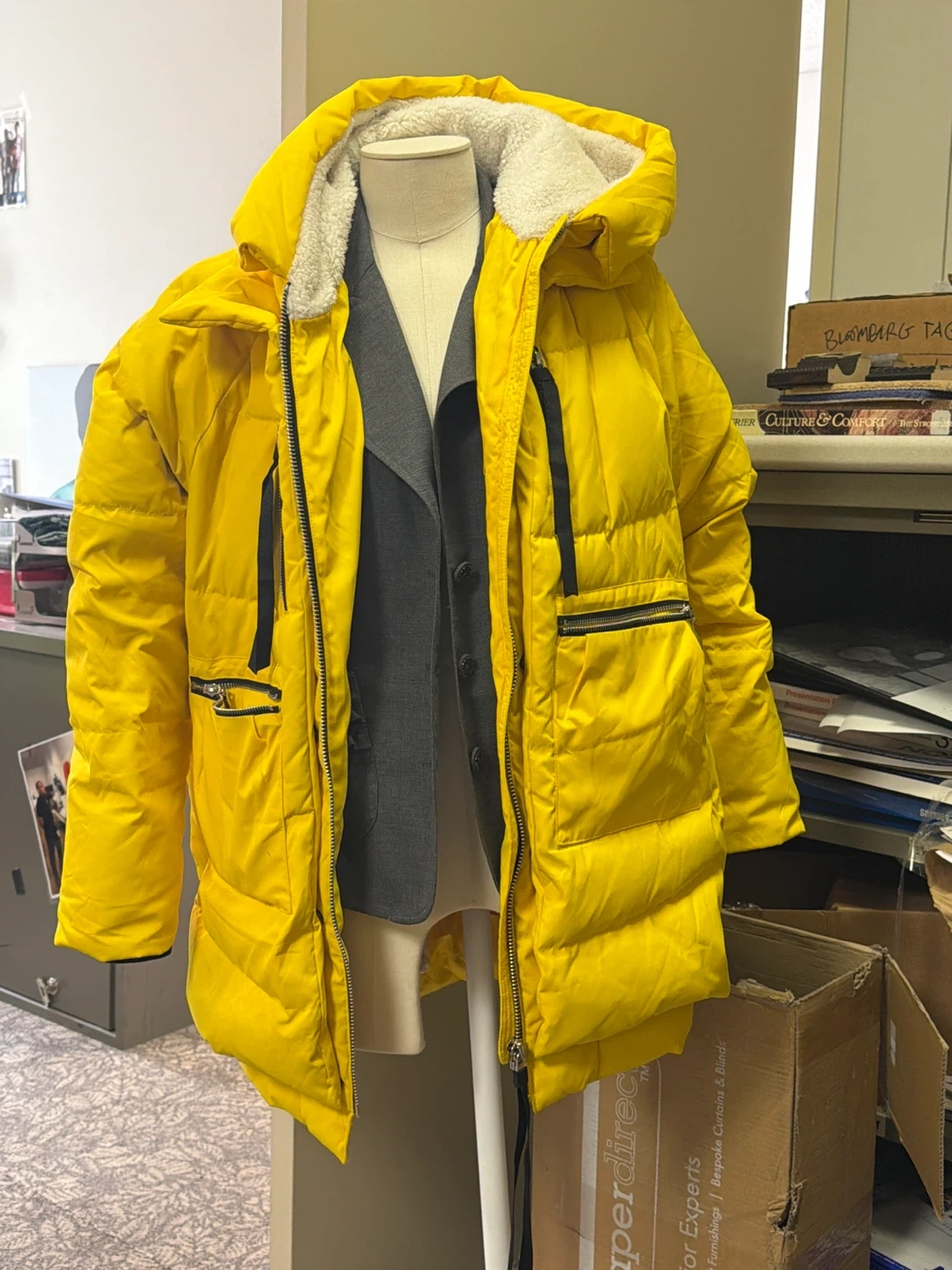 Super warm bright yellow puffer coat. It has a cozy sherpa-lined hood and multiple zippered pockets. Super warm, I wore it to Alaska. Fit size S or Medium US size 2-6