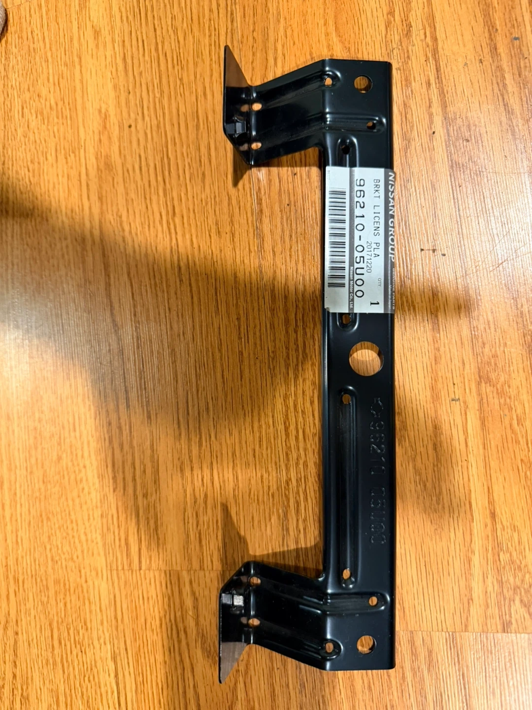 Genuine Nissan license plate bracket. Part number 96210-05U00. Manufactured December 20, 2017. This bracket is made of black metal.