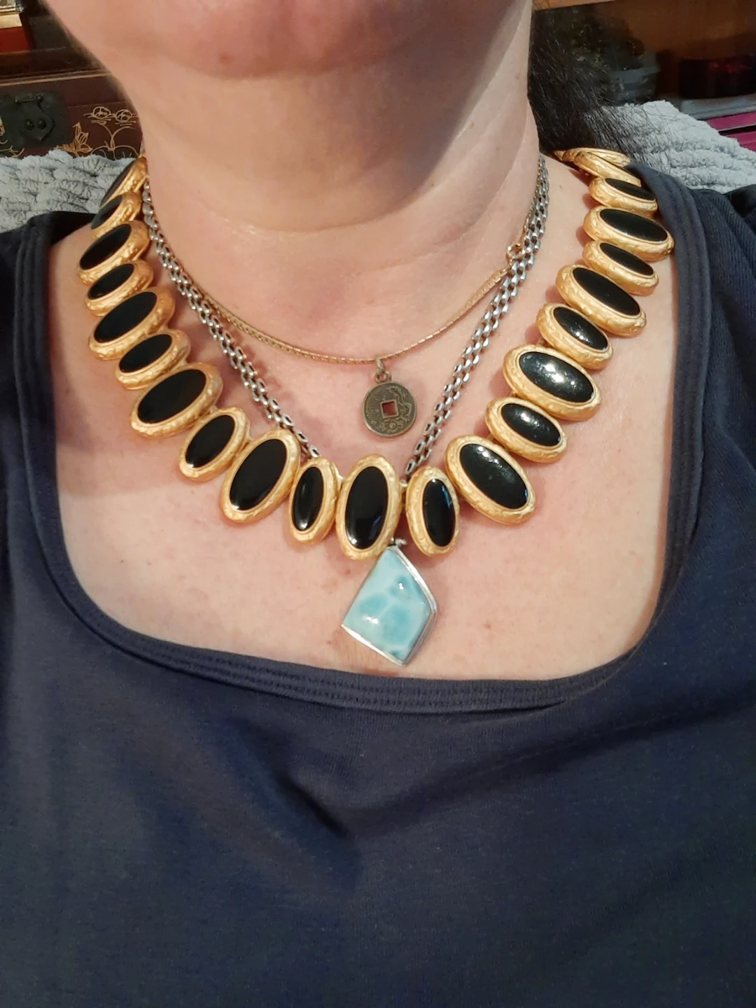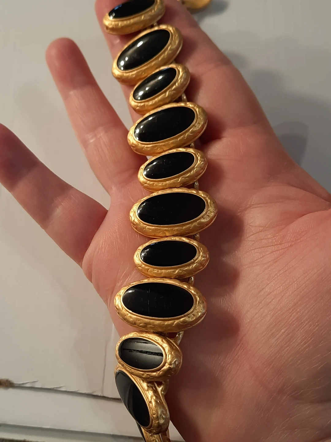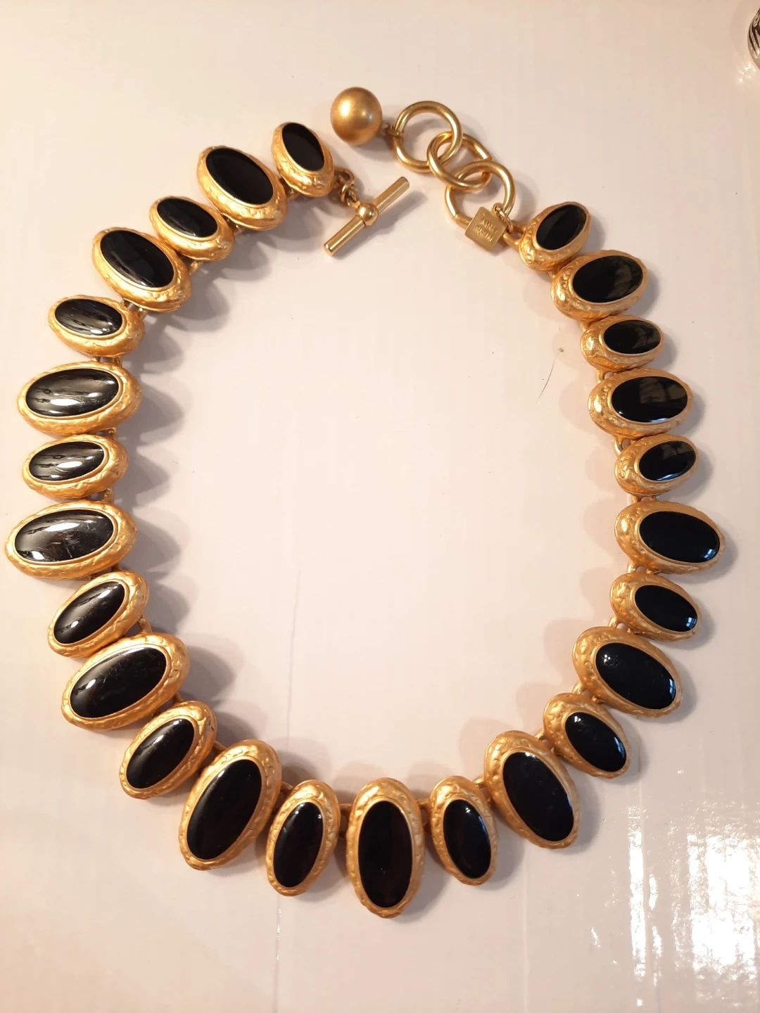 Gold tone necklace with black oval inlays. Features a toggle clasp closure. Necklace is approximately 18 inches long.