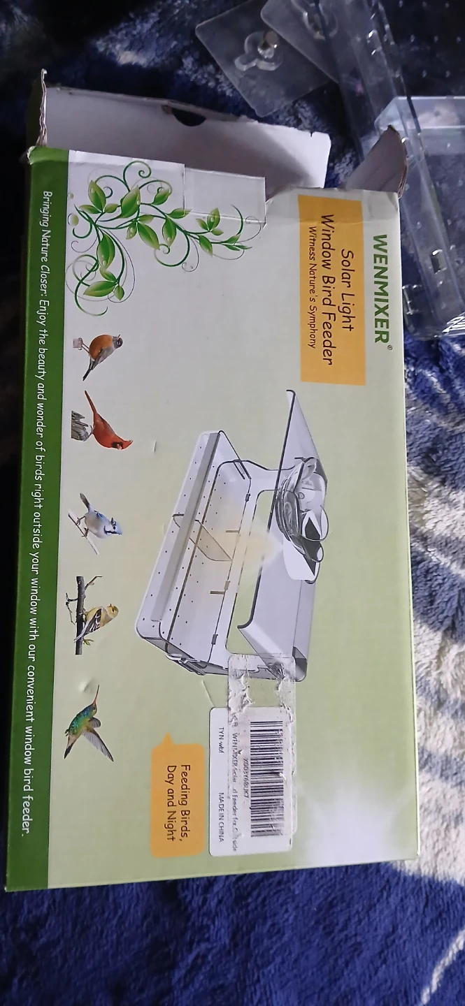 This WENMIXER window bird feeder features a solar-powered light for viewing day and night. It's made of clear acrylic for easy observation. Includes suction cups for window mounting.
