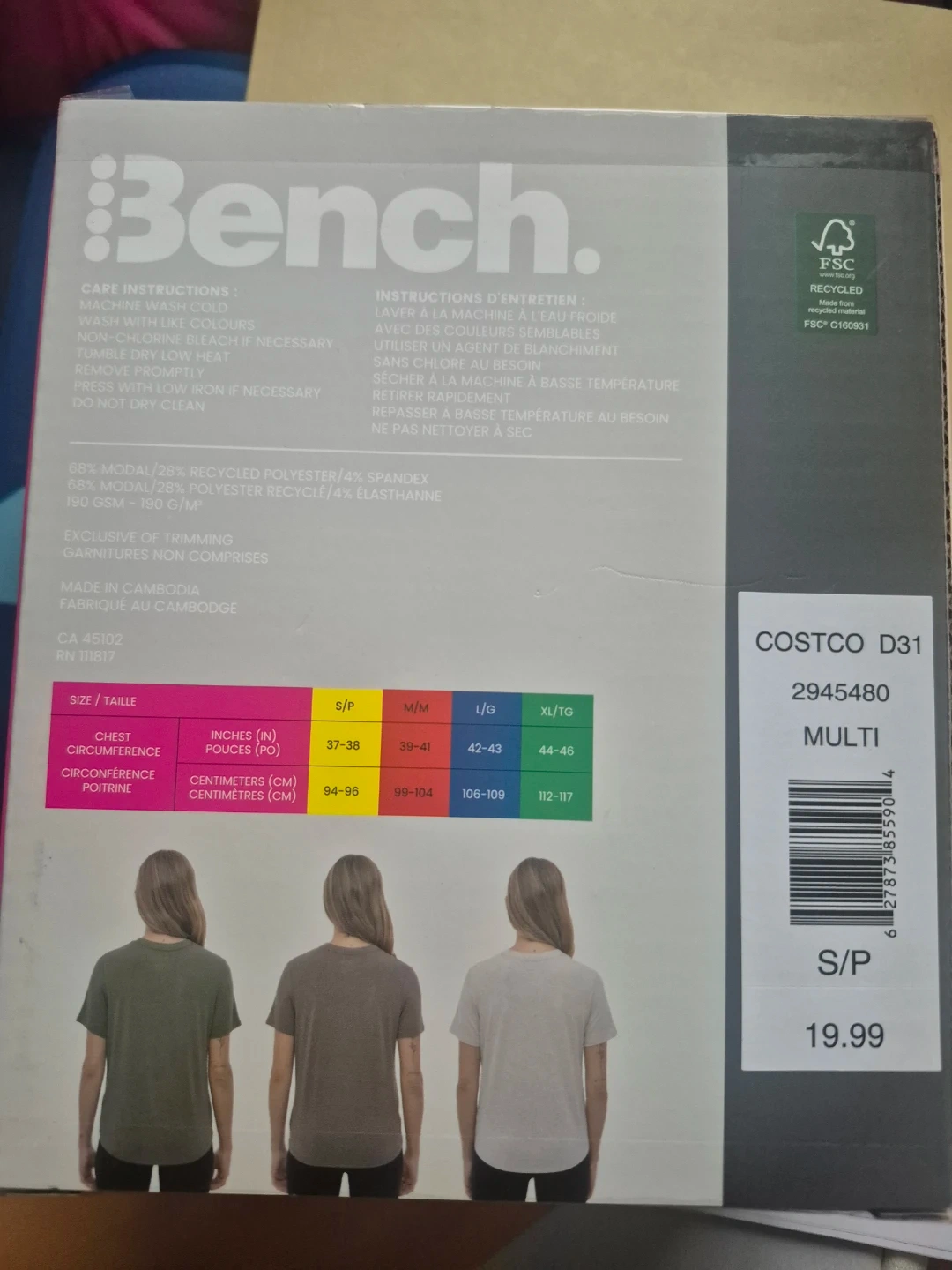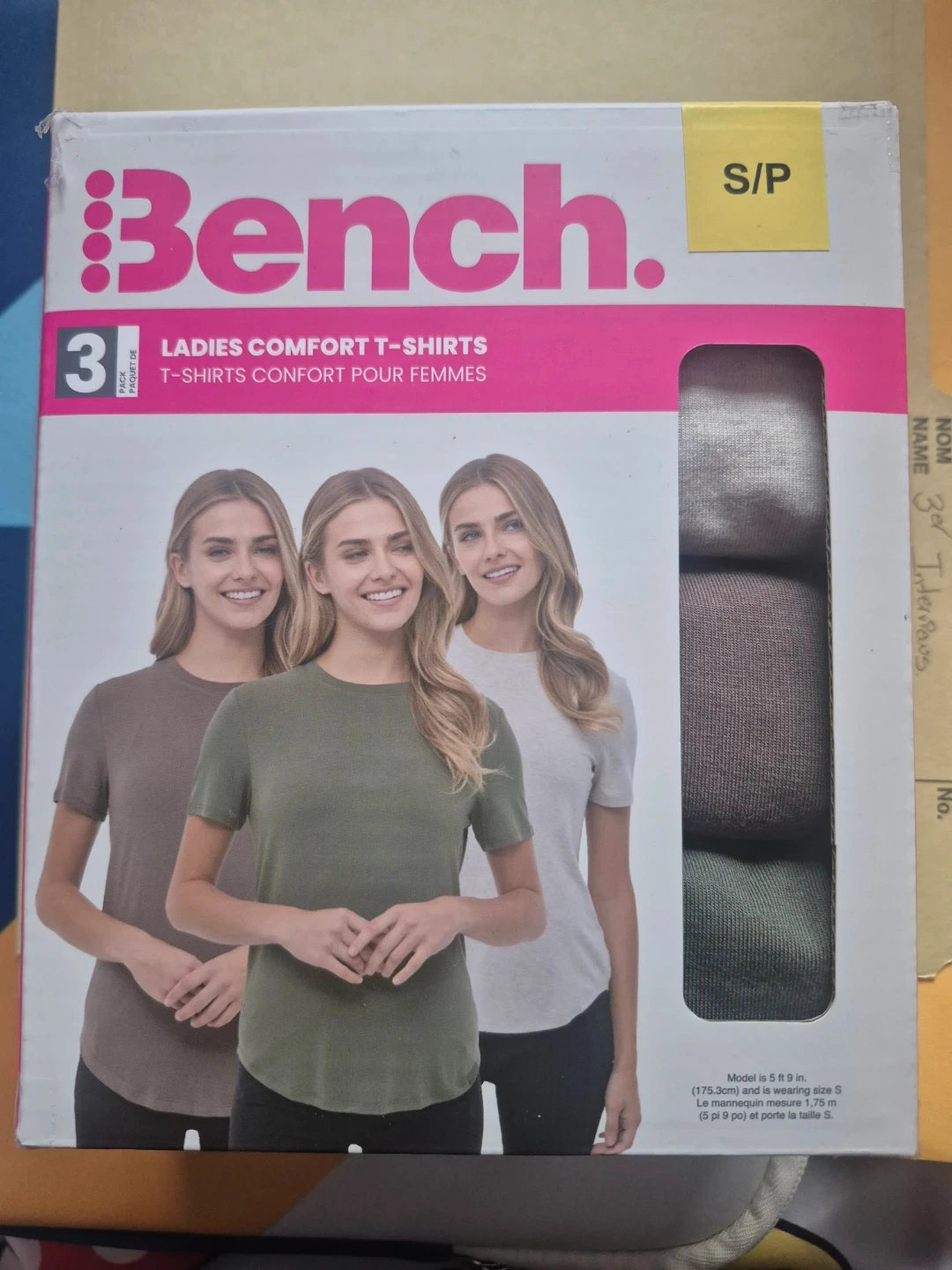 Three pack of Bench ladies comfort t-shirts in size S/P. Made from 68% Modal, 28% Recycled Polyester, and 4% Spandex. Machine wash cold with like colours.