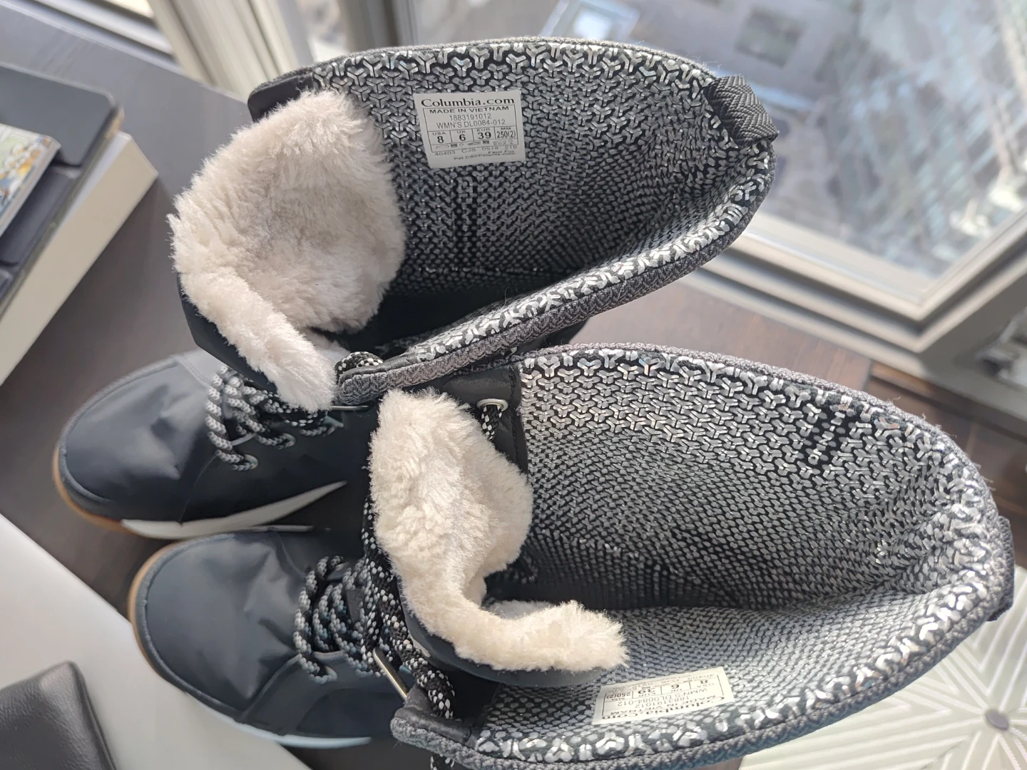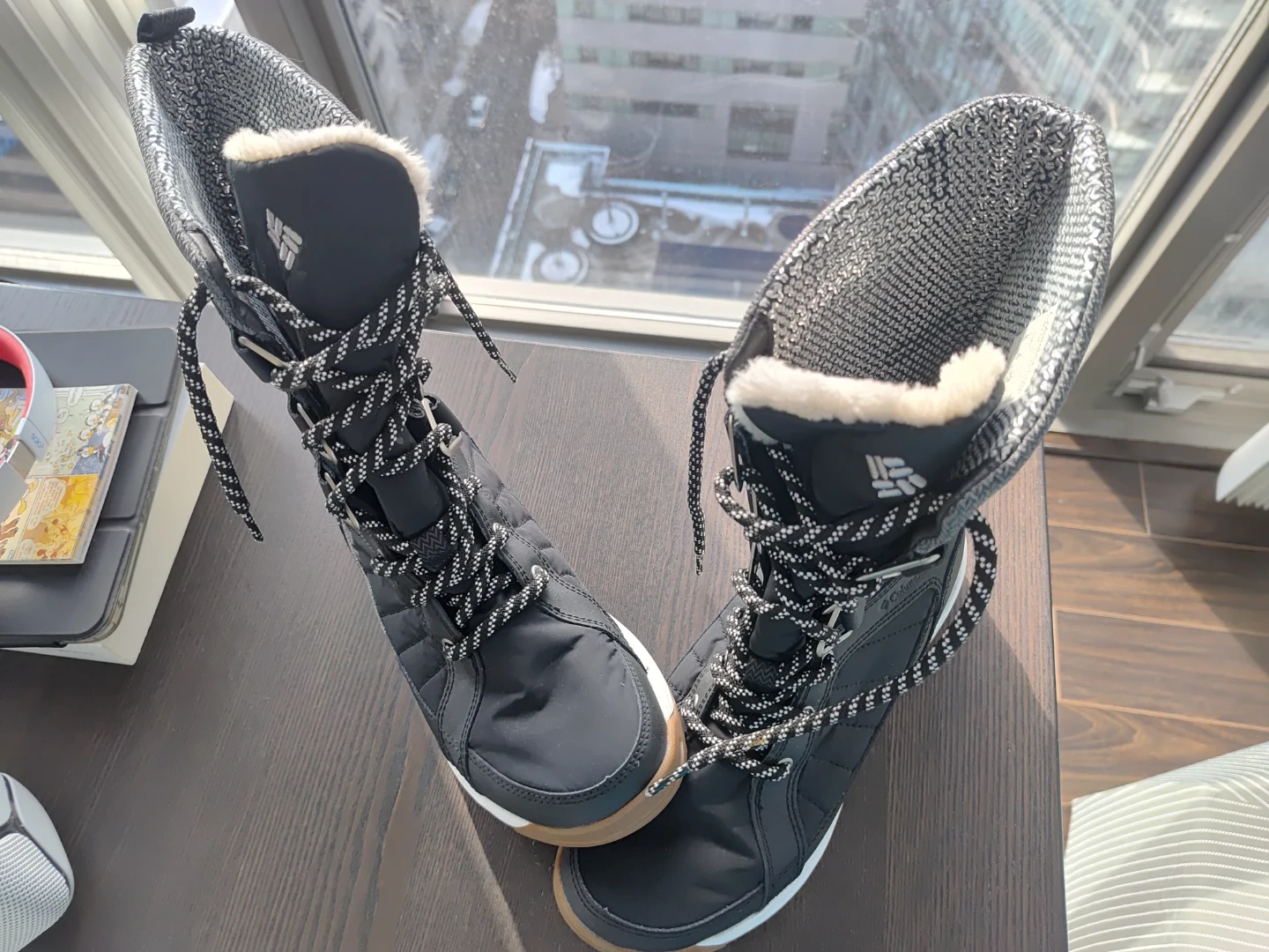 Columbia women's snow boots in black and tan. These boots are insulated and waterproof, designed for cold weather. They're a size 8 with a secure lace-up closure. Perfect for keeping your feet warm and dry during winter activities!