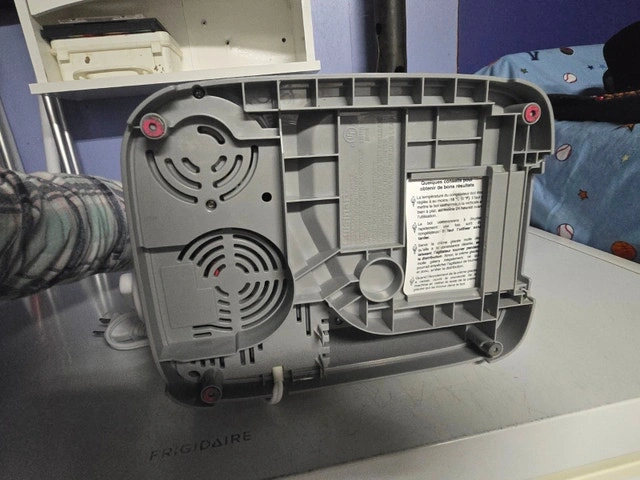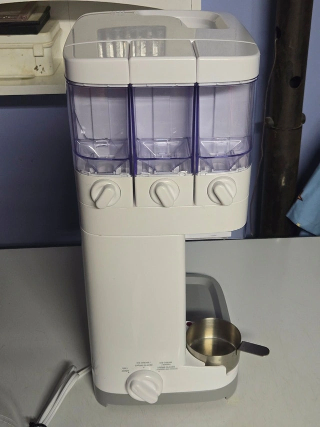 Cuisinart soft serve ice cream machine in good working condition. Makes smooth, creamy soft ice cream at home, perfect for summer treats. There is a small crack on the side of the container (shown in photo), but it does not affect performance or function. From my experience, the texture and amount of cream determine how soft or firm the ice cream turns out; it's best not to add too much for the right consistency. Key Features: Trusted Cuisinart brand, makes soft serve ice cream, frozen yogurt, and sorbet. Includes built-in cone holder, built-in syrup meltor, dispensing handle, and mixing container. Easy to use and clean. Tested and working properly. Minor cosmetic crack on clear side panel (no leaking, no performance issue).