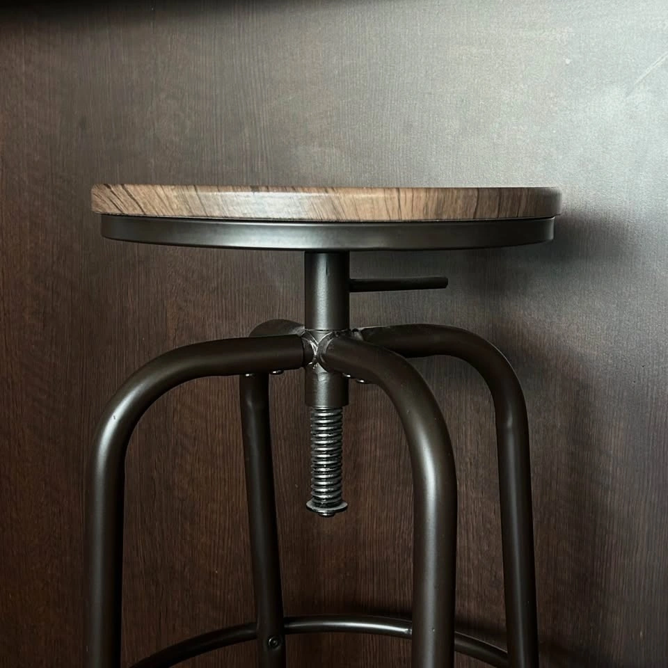 Set of metal bar stools with dark wooden design seats