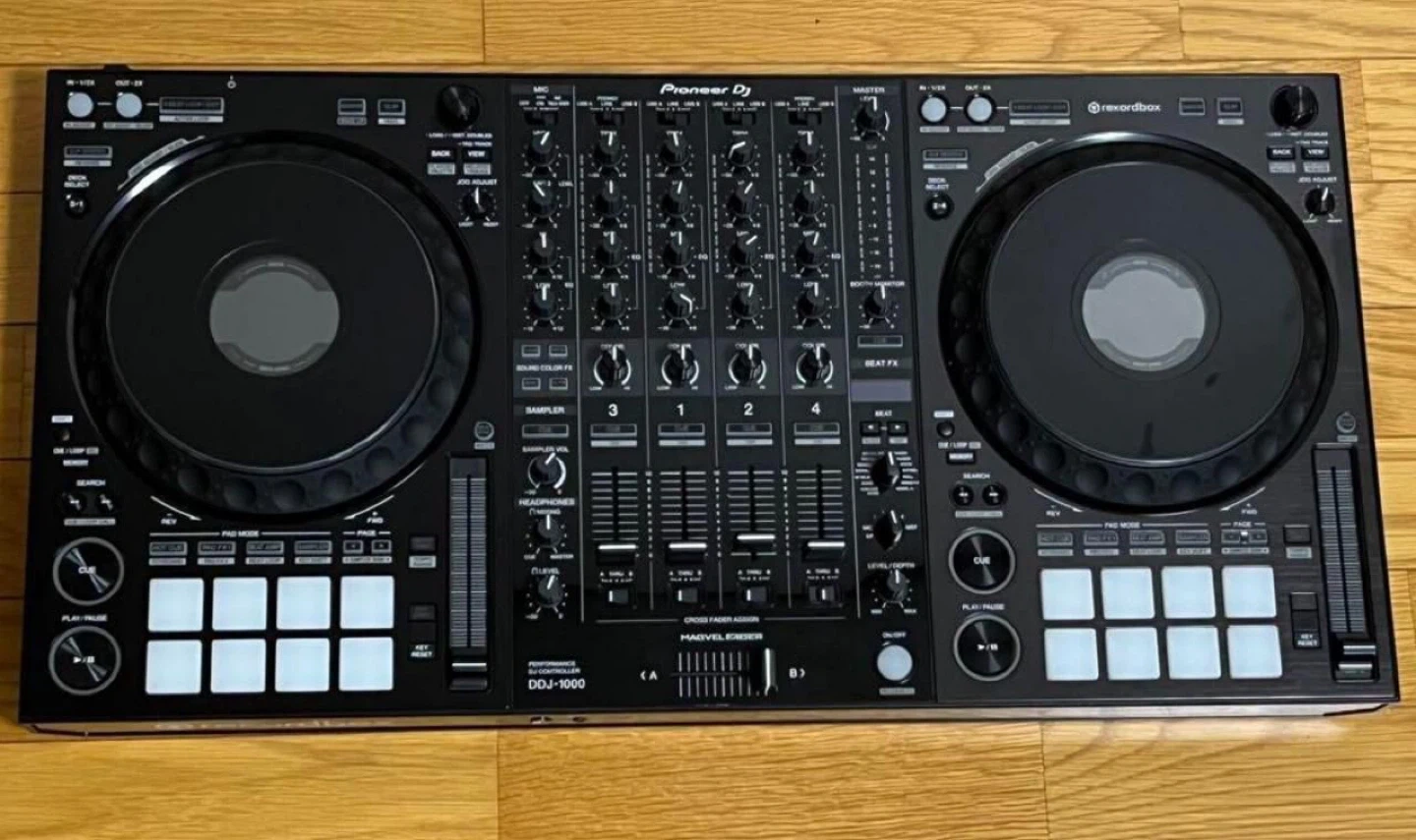 This is the Pioneer DJ DDJ-1000 controller for Rekordbox DJ. It features full-size jog wheels and a four-channel mixer. It's great for professional DJs and aspiring artists.