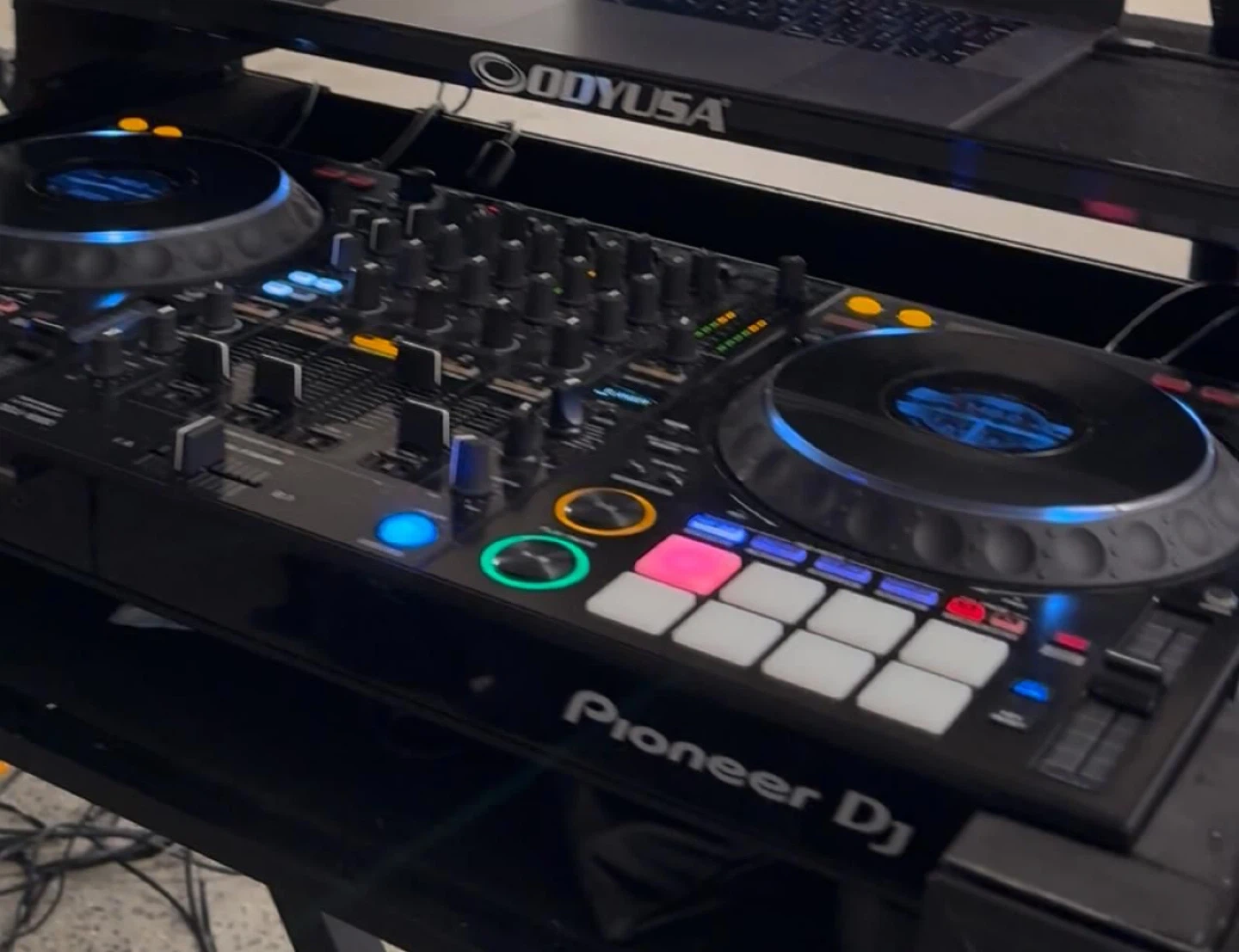 This is the Pioneer DJ DDJ-1000 controller for Rekordbox DJ. It features full-size jog wheels and a four-channel mixer. It's great for professional DJs and aspiring artists.