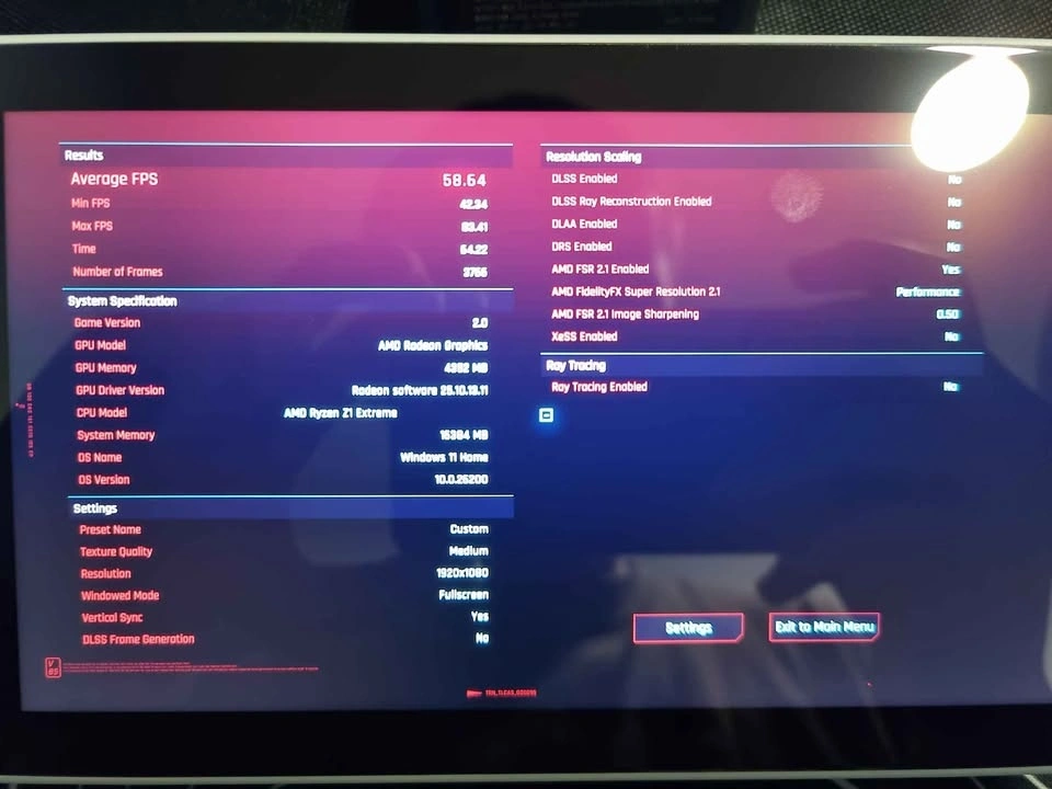 Cyberpunk 2077 runs at an average of 60 FPS on medium settings. See the video in the listing for the full benchmark test and check the photos for the exact graphics settings used. Other games run around or above 60 FPS depending on settings.
