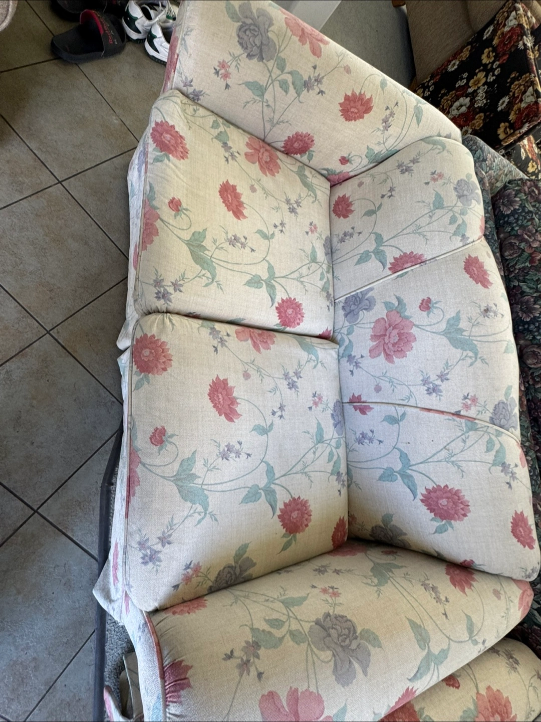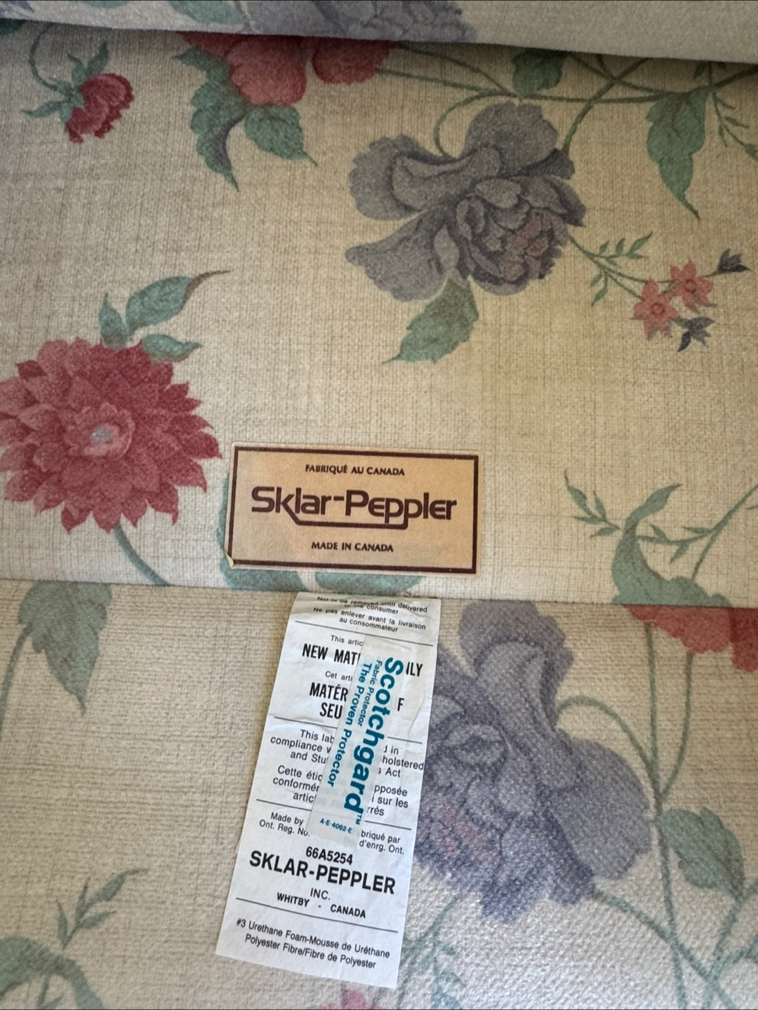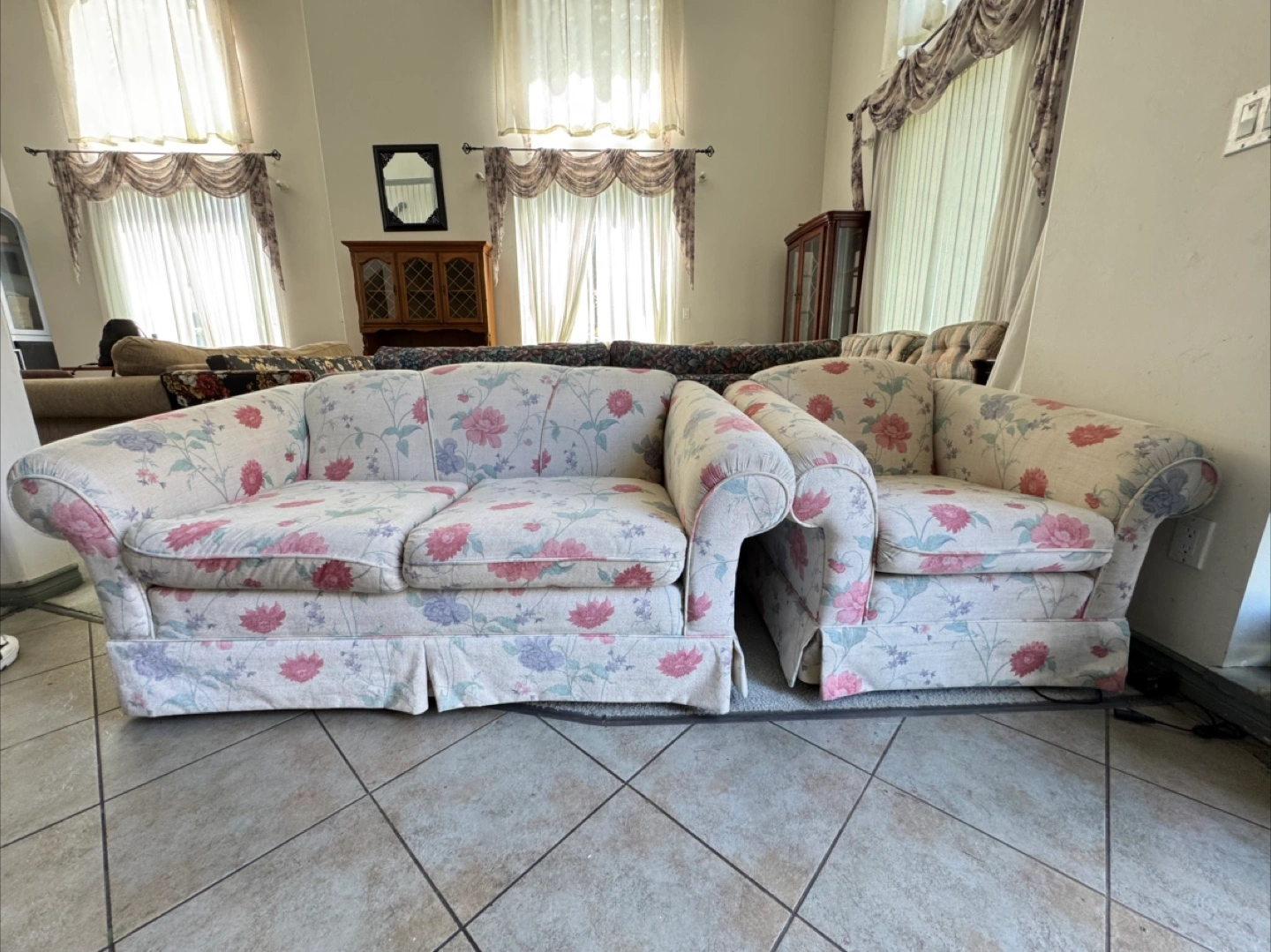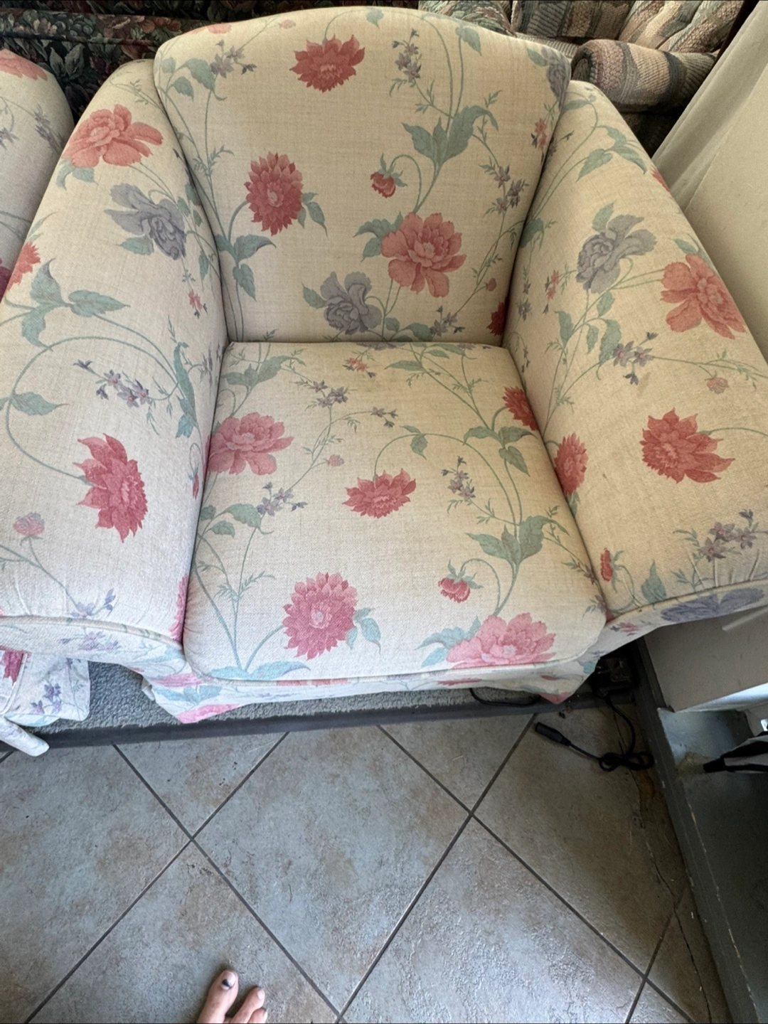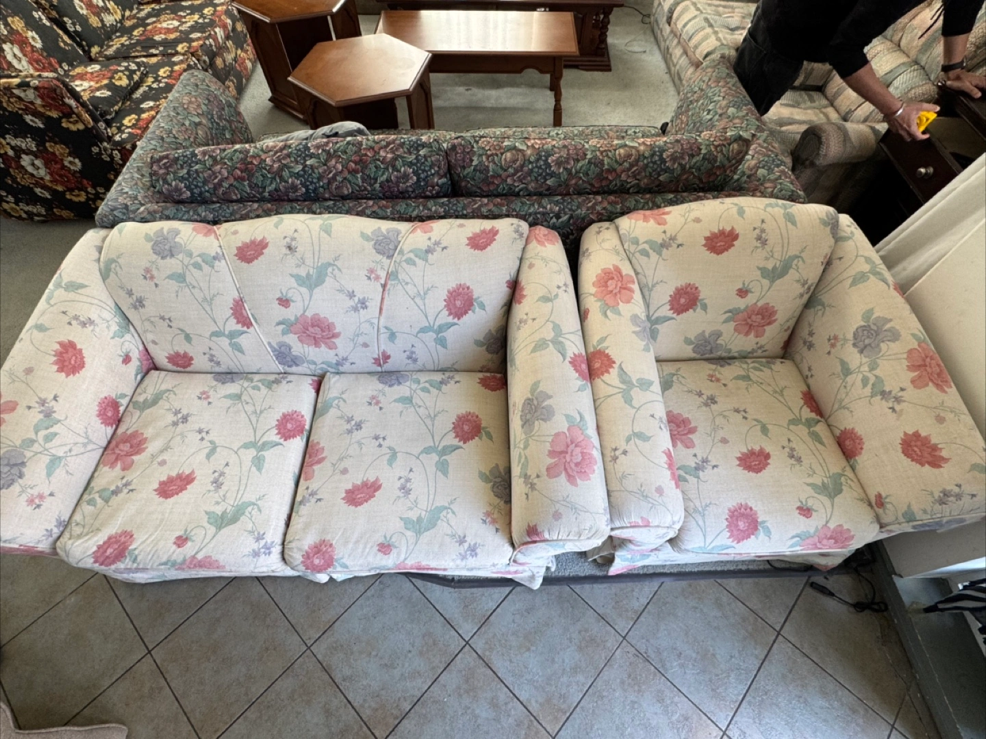 Lovely floral patterned sofa and armchair set. Cream base with pink and purple flowers. Rolled arms. Suitable for a living room or den. Pre-owned.