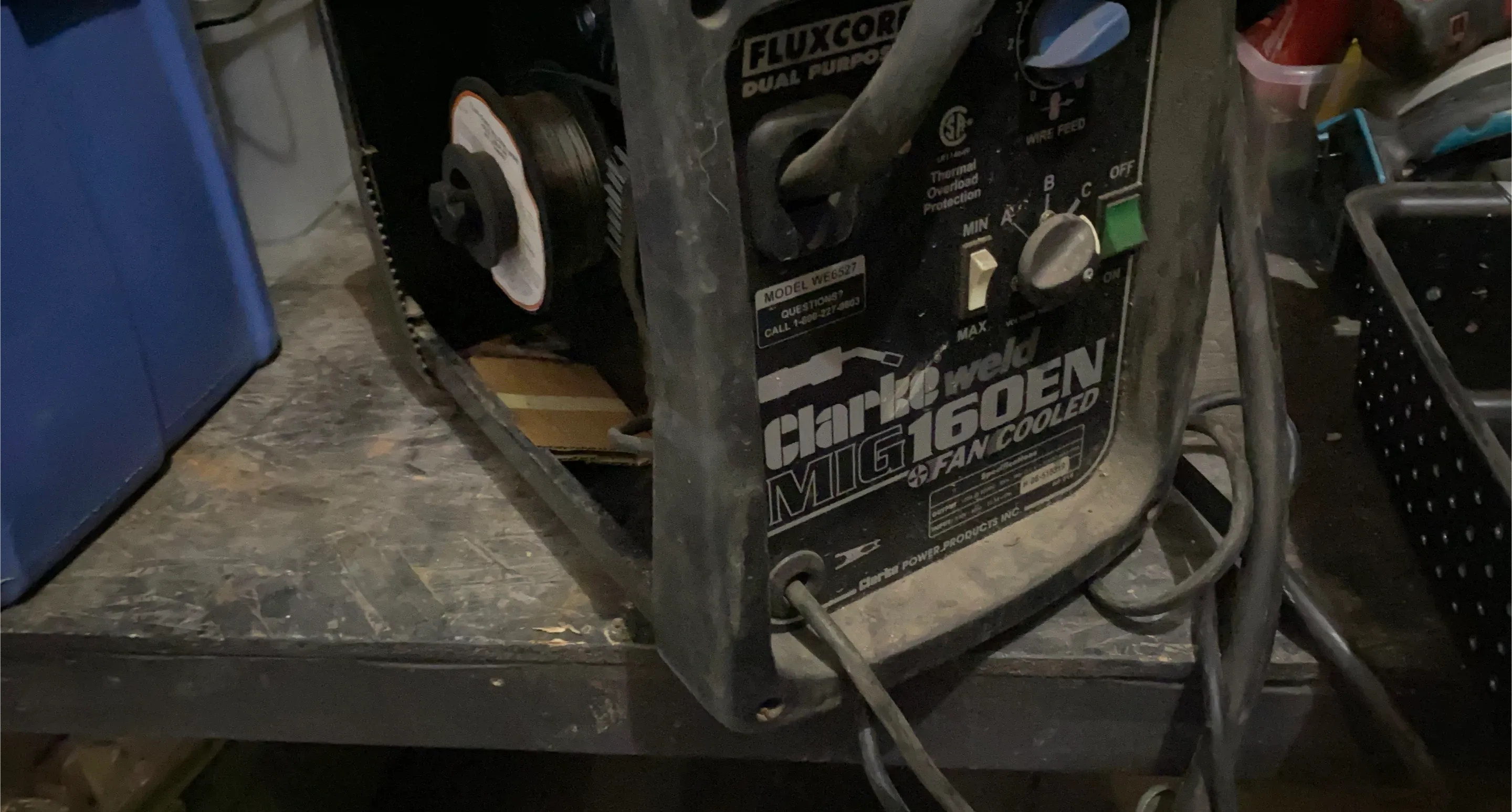 This is a Clarke weld MIG 160EN welder. It's fan-cooled and features thermal overload protection. The model number is WE6527. This welder is suitable for flux-cored dual-purpose use.