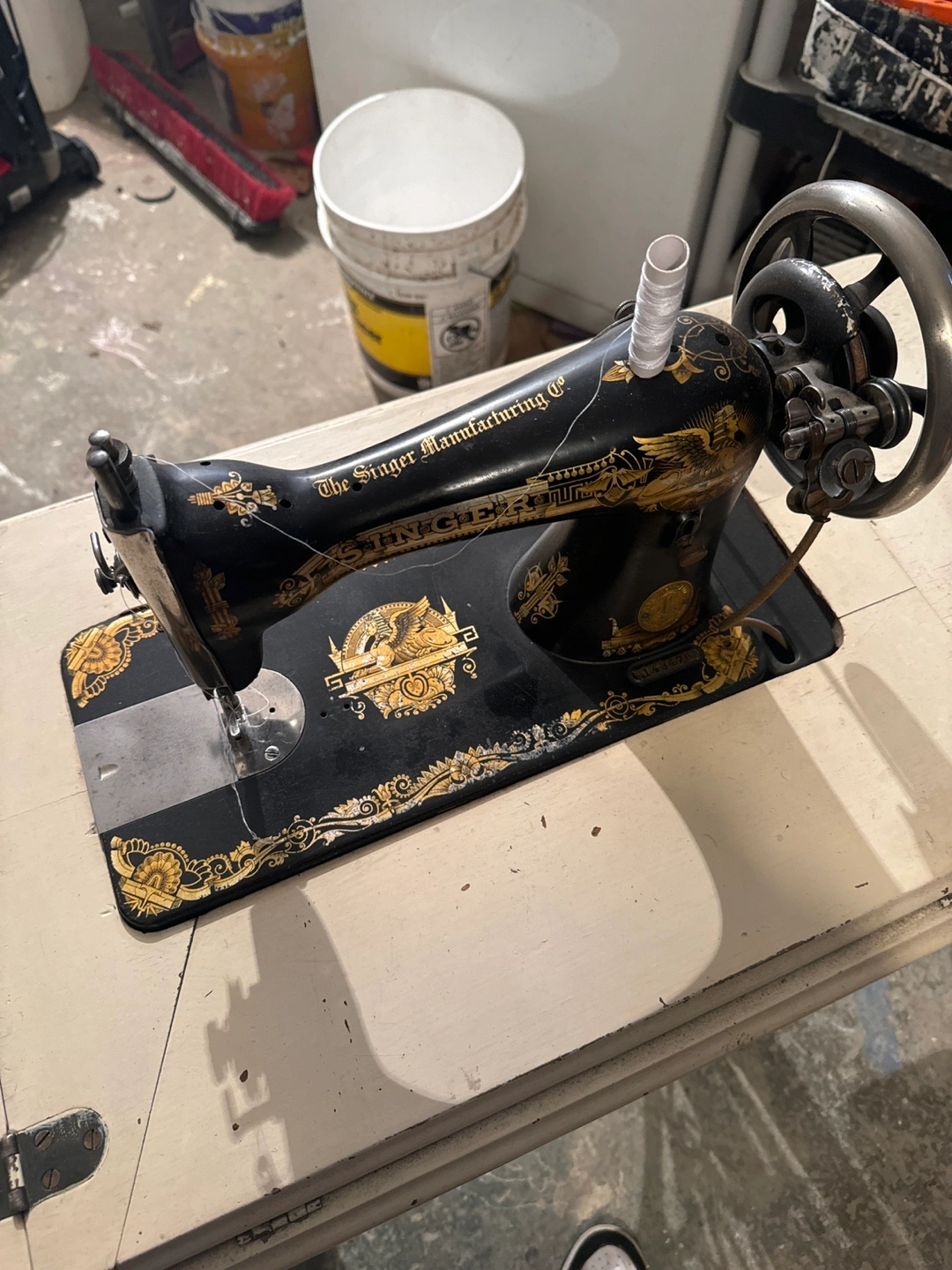 This is a vintage Singer sewing machine set in a table. It features a decorative black and gold sewing machine head. The table has multiple drawers and a pedal for operation. This piece would be a great addition for anyone interested in antique sewing equipment.