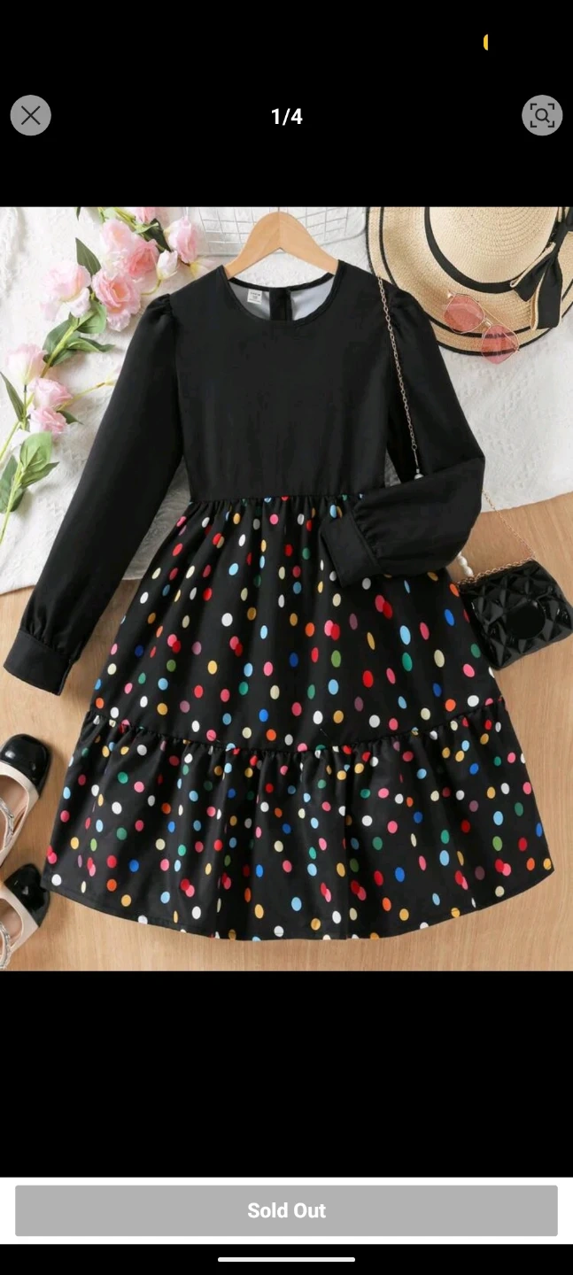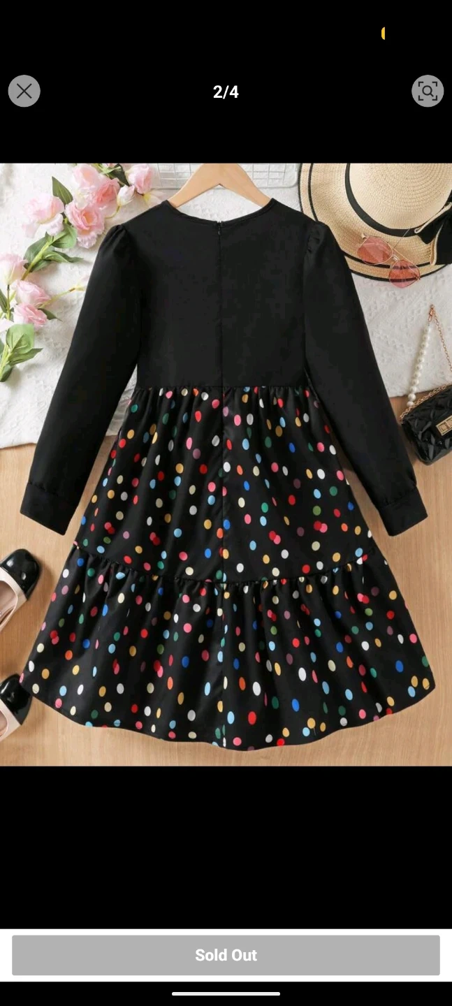 A black long-sleeved dress with a colourful polka dot print on the skirt. It features a tiered ruffled hem. Made for girls.