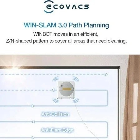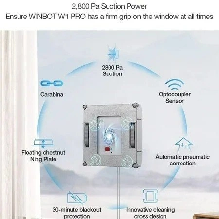 The robot attaches well with 2,800Pa suction power , which frees your hands & time out of the annoying window cleaning work and avoids the risk of standing and working at height. Cross water spray technology: The unique cross spray in dual directions effectively keeps a constant mopping humid status, dissolving stubborn stains as easy as anything. Highest safety: The internal drive system ensures non-slip steady movement and protection against power failure, thanks to high-quality materials and precise gravity settings, which can t be safer. WIN SLAM 3.0: The robot cleans the window completely and thoroughly with an effective forward-reverse motion in 3 adaptive modes: quick cleaning, deep cleaning and spot stain removal. Edge detection: Even frameless glasses cleaning is nothing difficult due to the high precision coupling sensor, which detects edges and fits the cleaning path within 0.02 seconds. 60ml reservoir: The strong capacity of reservoir and water-saving spray enables neither frequent mopping pad replacement nor frequent water tank refilling. App Control Features User-friendly design allows controls over cleaning modes, preferences, and voice notifications and alerts. Position memory: The robot automatically returns to its starting point once the window gets radiantly clean, convenient on every huge and out-of-reach surfaces. Box contents: 1* robot, 1* power adapter, 1* safety rope, 2* cleaning mops, 1* water container, 1* instruction manual.