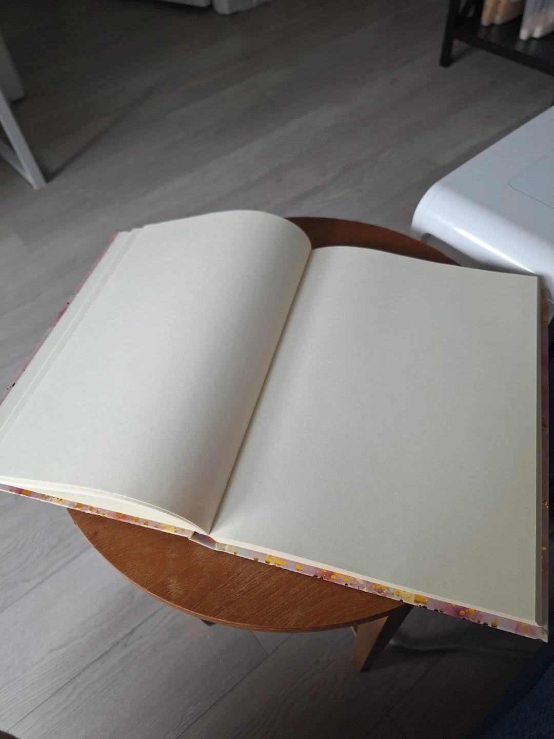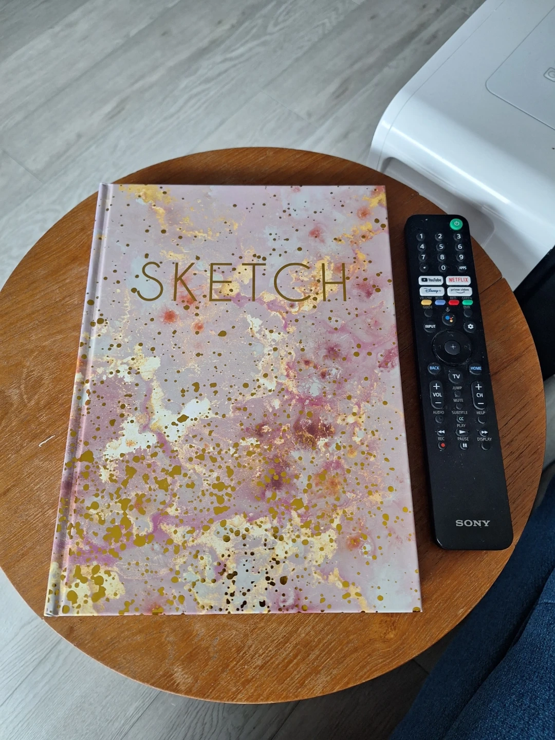 A lovely sketchbook perfect for your creative projects. It has a stylish marble and gold splatter design on the cover. The pages are blank and ready for your art!