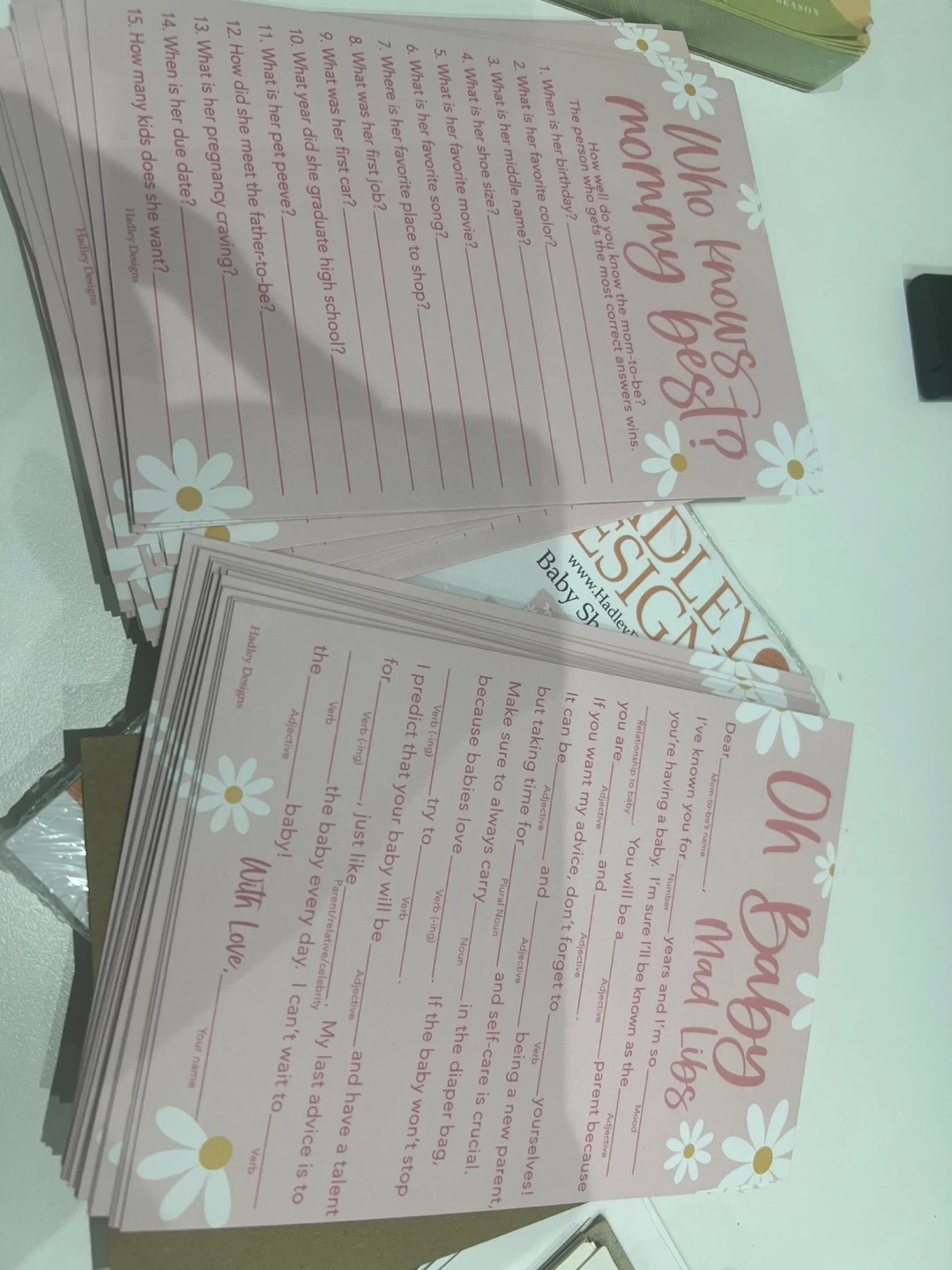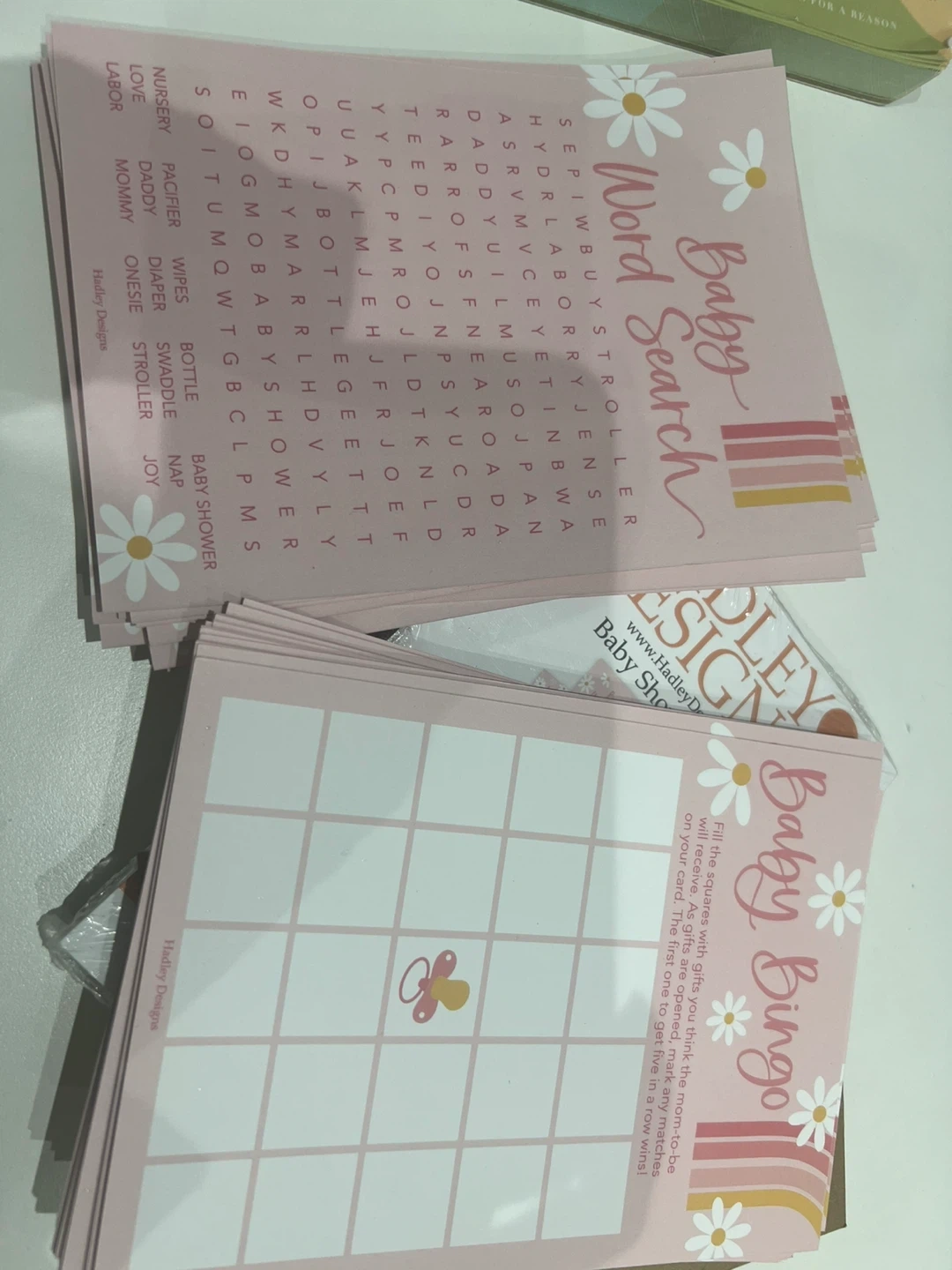 New Hadley Designs baby shower games set! Has 4 fun games: Baby Word Search, Baby Bingo, Who Knows Mommy Best, and Oh Baby! Mad Libs. Pink with cute daisy and rainbow designs.