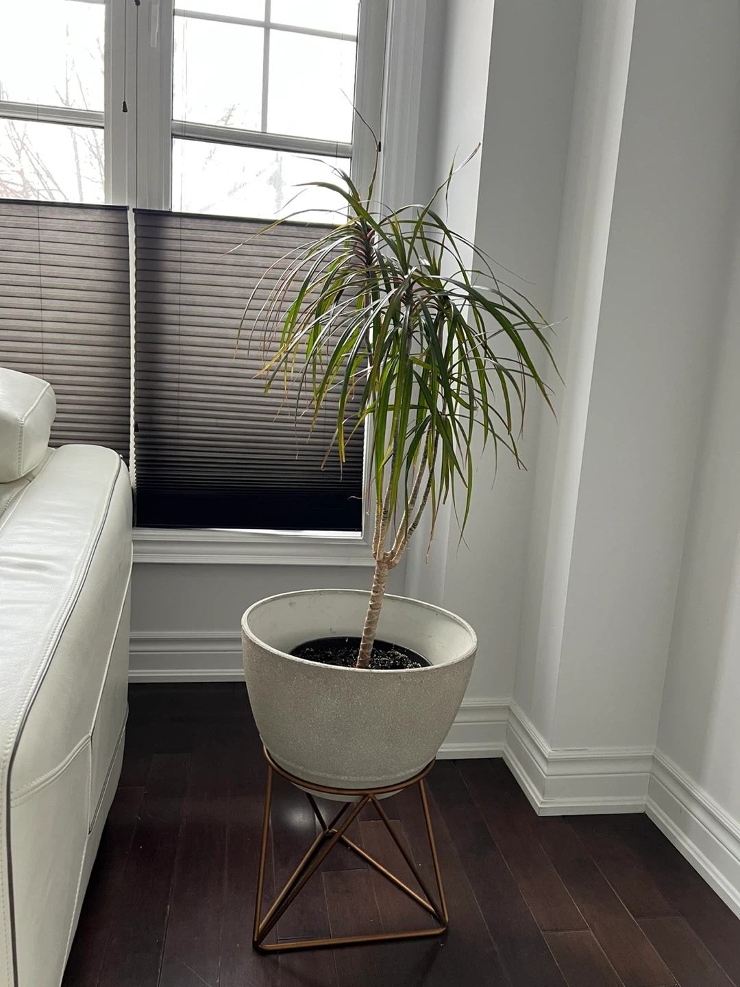 This tall Dracaena plant comes in a speckled grey pot with a modern gold geometric stand. It's a lovely statement piece for any room. The plant is healthy and ready for a new home!