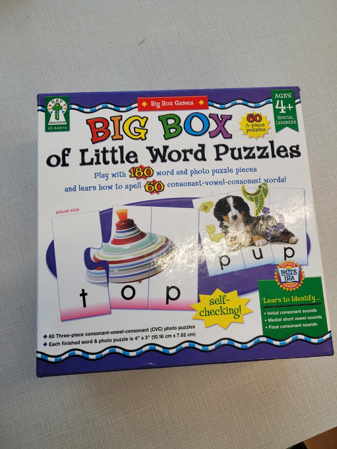 I'm selling a Big Box of Little Word Puzzles! It's designed for ages 4+. This set includes 60 three-piece consonant-vowel-consonant (CVC) photo puzzles. Each finished word & photo puzzle is 4" x 3" (10.16 cm x 7.62 cm). A fun way to learn to identify initial, medial, and final consonant sounds
