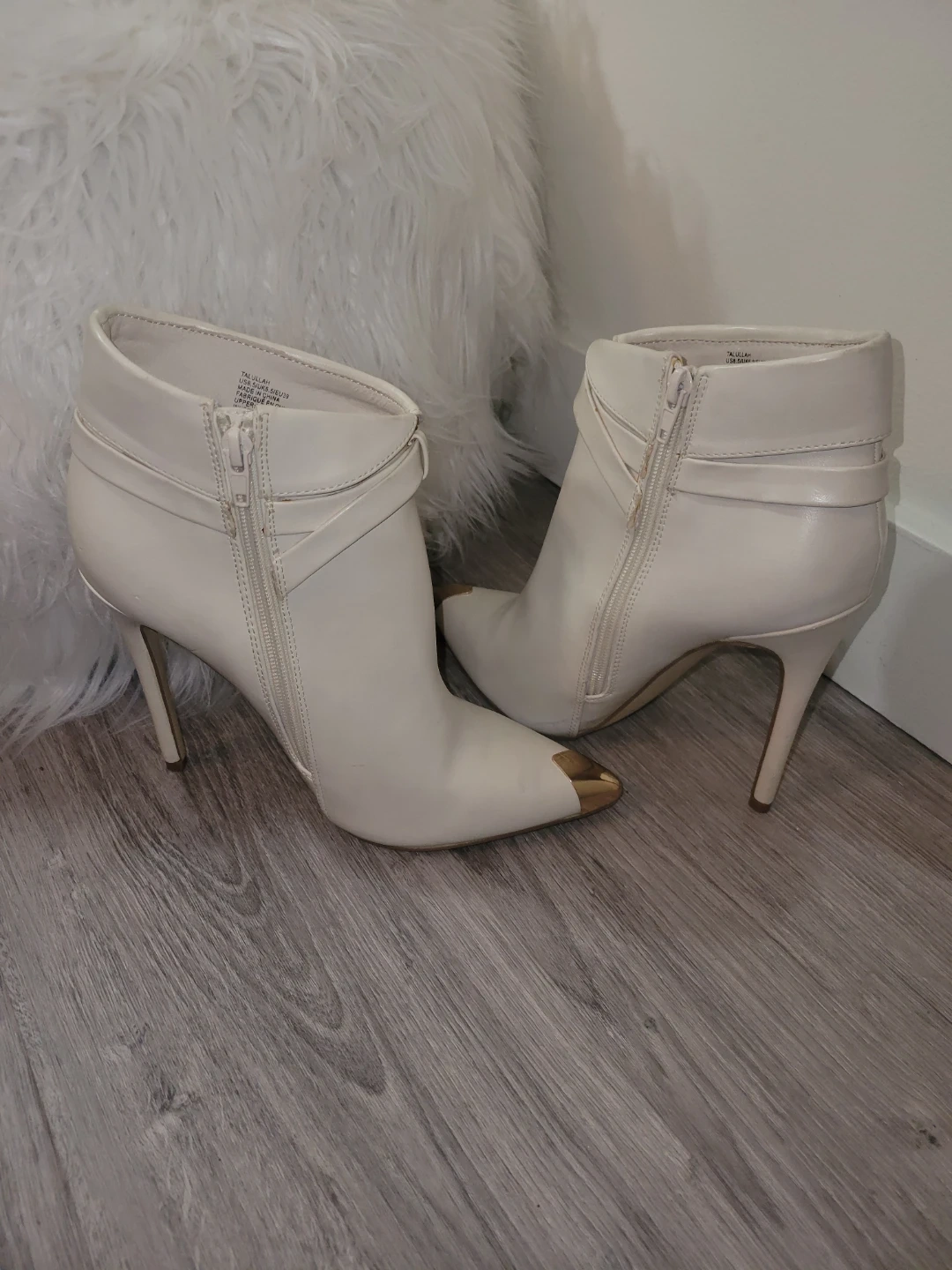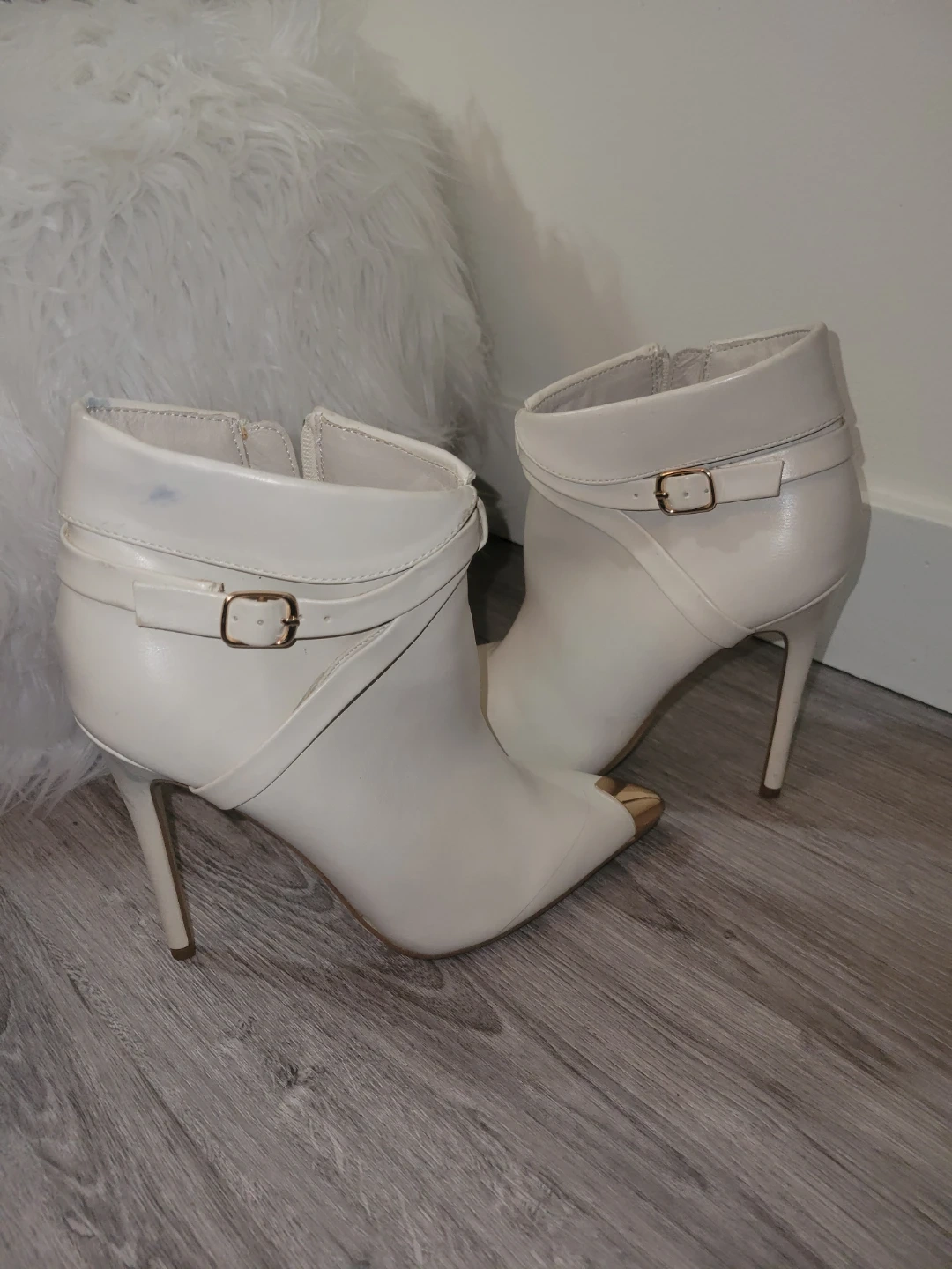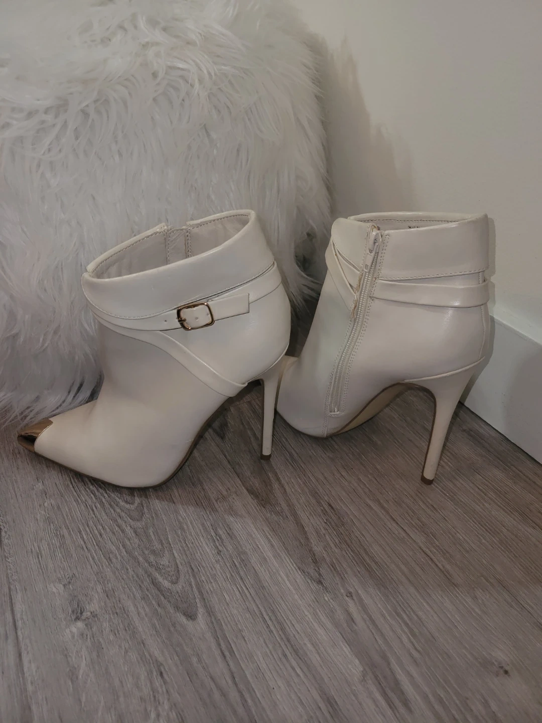 Stylish white ankle strap heels featuring a gold toe cap. These shoes have a side zipper for easy wear. They're great for dressing up any outfit!