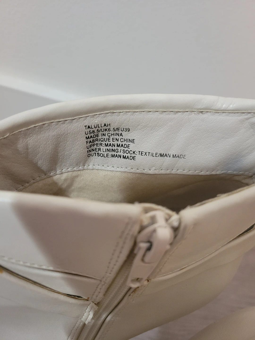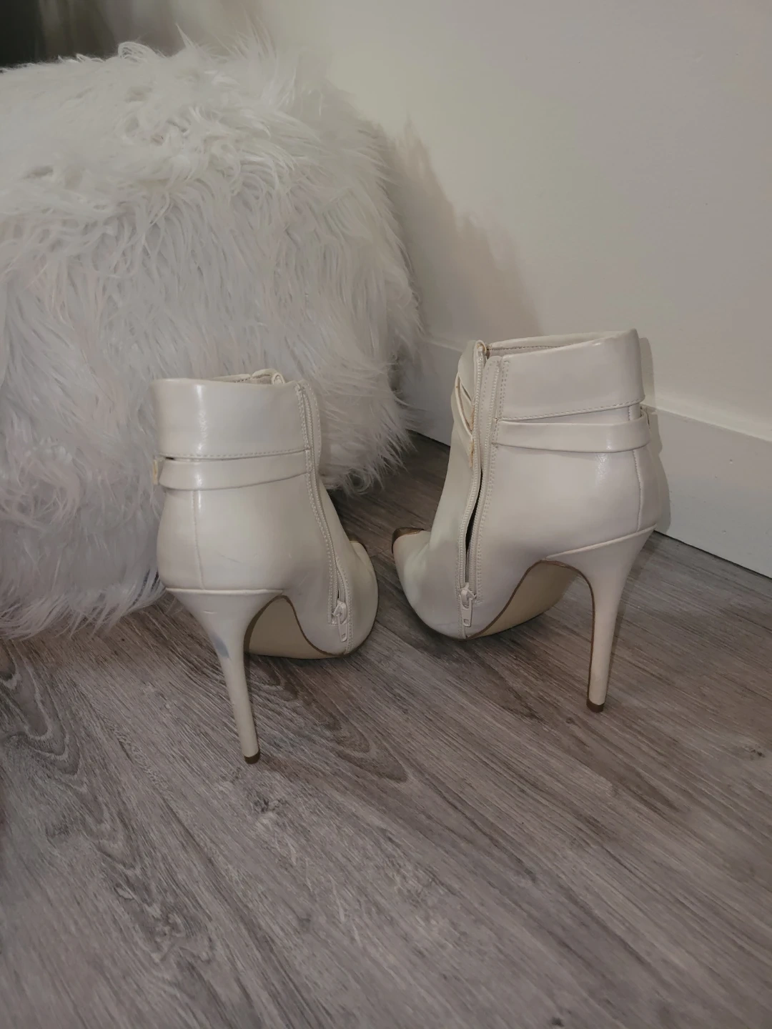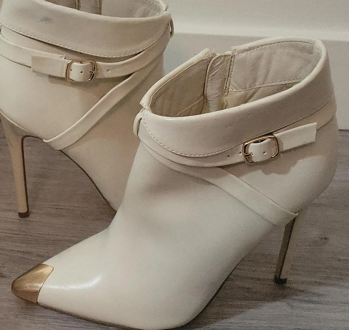 Stylish white ankle strap heels featuring a gold toe cap. These shoes have a side zipper for easy wear. They're great for dressing up any outfit!