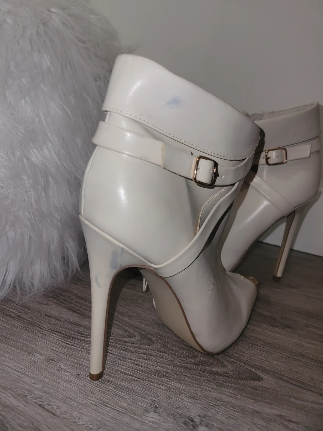 White Ankle Strap Heels with Gold Toe Cap