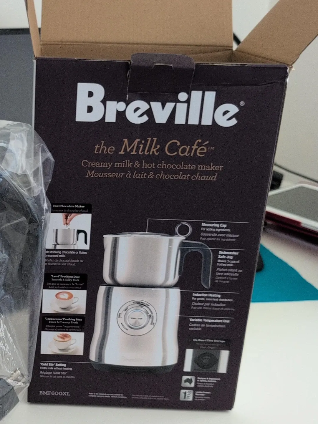 This Breville Milk Cafe makes creamy milk and hot chocolate. It features a variable temperature dial from warm to hot. Includes the milk frothing discs (latte or cappuccino )and original box.