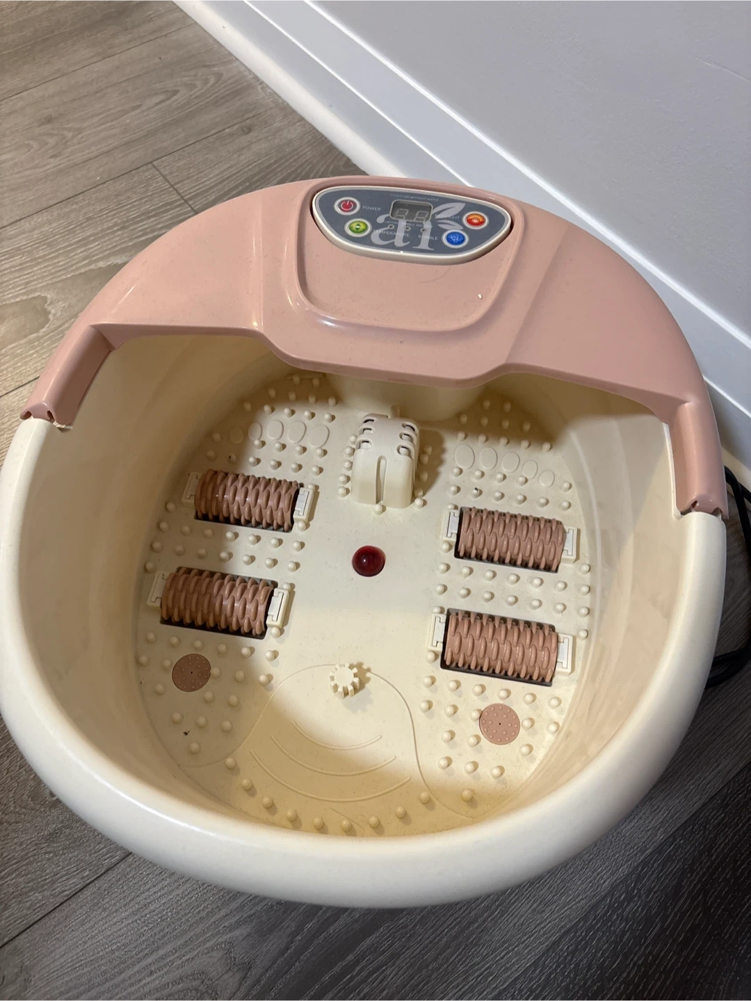 This foot spa massager has four rollers for a relaxing foot massage. It features a digital display and controls for heat and bubble settings. It's great for soothing tired feet after a long day!