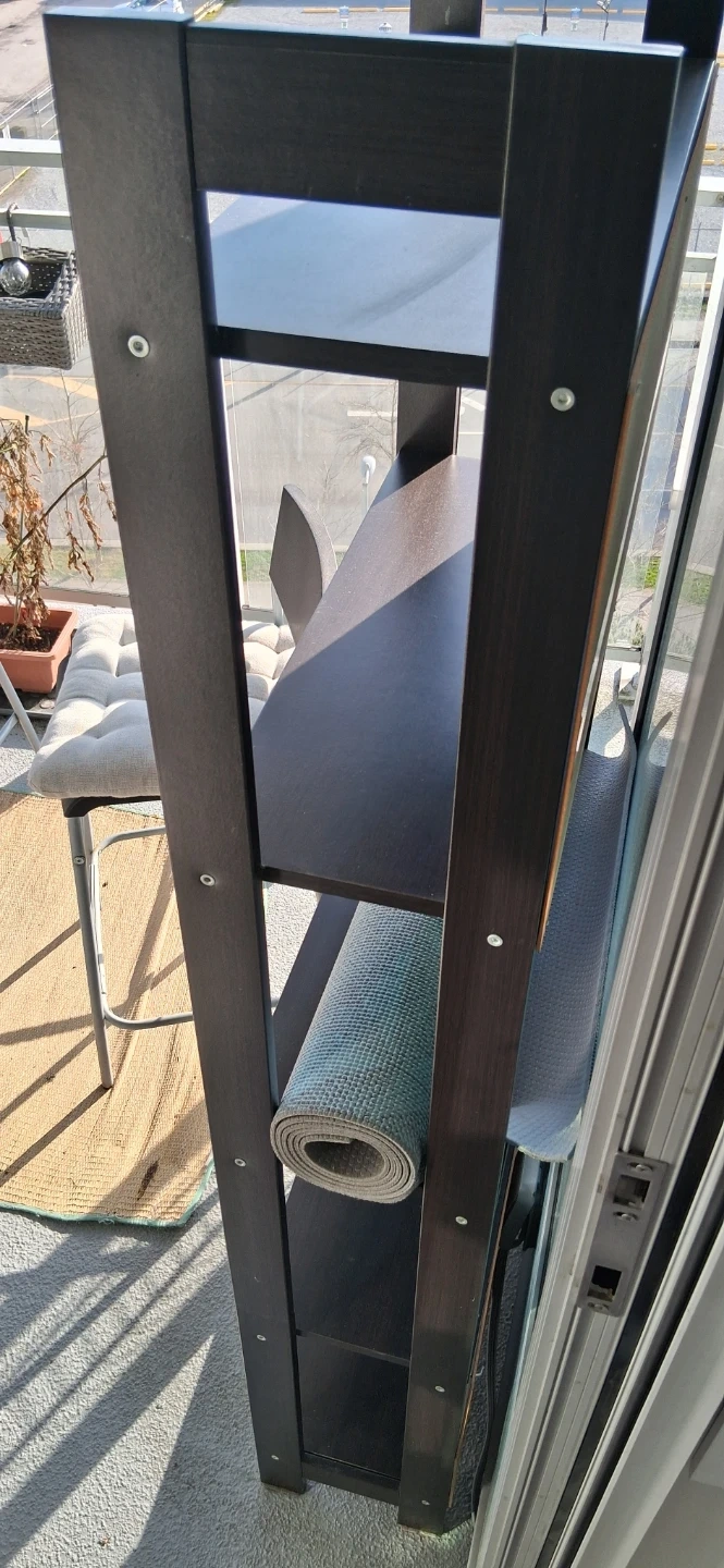A dark brown ladder bookshelf with four shelves. It has a wooden construction and a simple, modern design. This bookshelf is great for displaying books, plants, or decorative items.