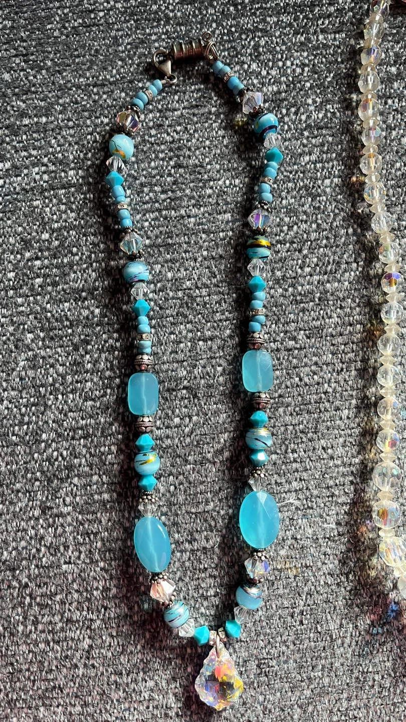 This handcrafted necklace features a vibrant mix of turquoise, sky blue, and clear crystal beads. It has a magnetic clasp for easy wear. A large, faceted crystal pendant adds a touch of sparkle!