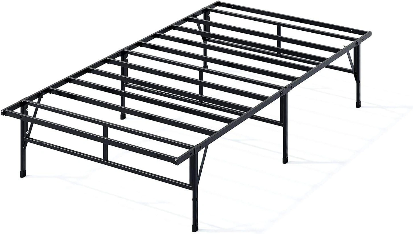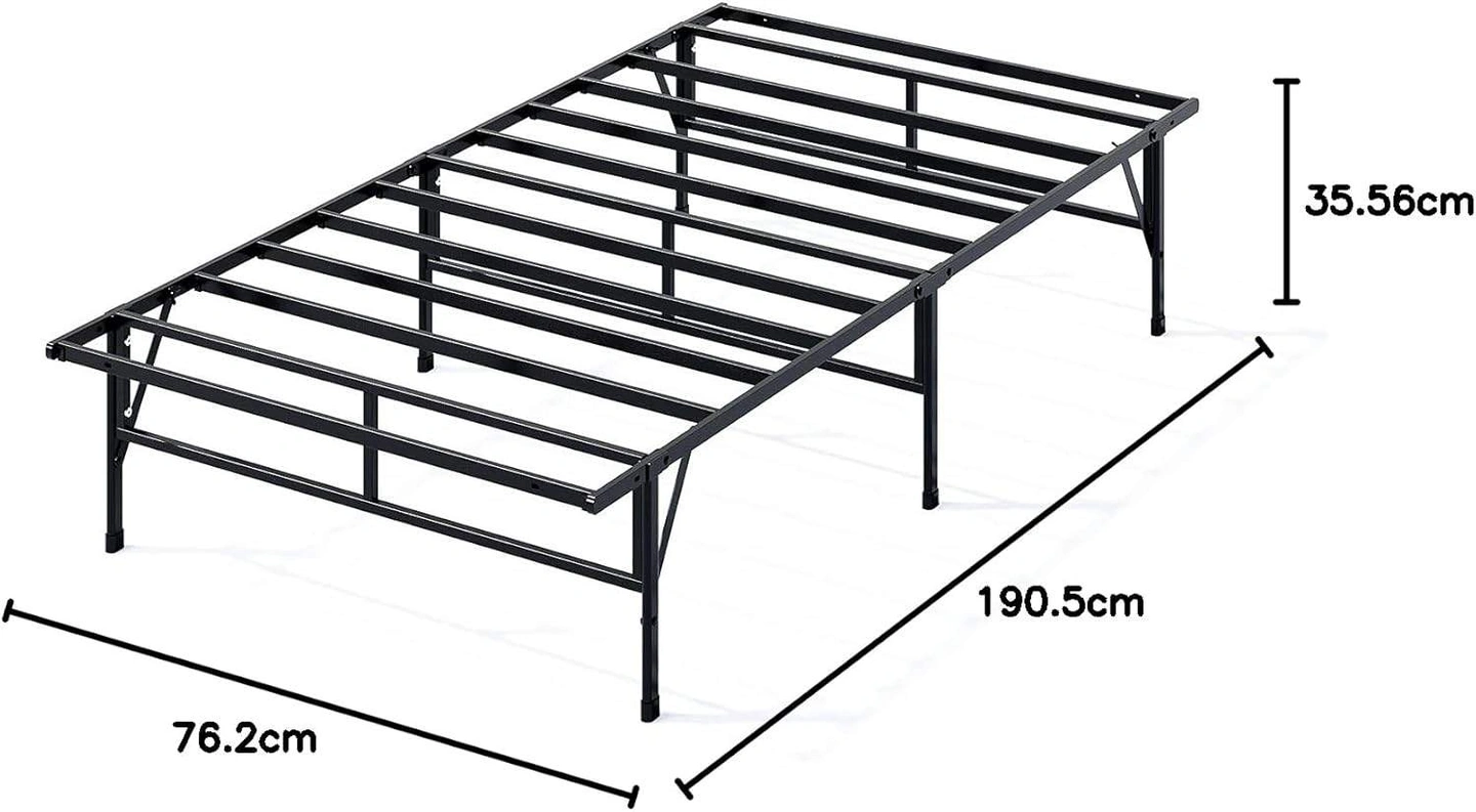 Selling a twin-size metal bed frame New in box! It measures approximately 74 inches long and 30 inches wide, with a height of about 14 inches. It's a sturdy frame that can support up to 750 lbs. The bed frame is black and provides a solid base for any twin mattress