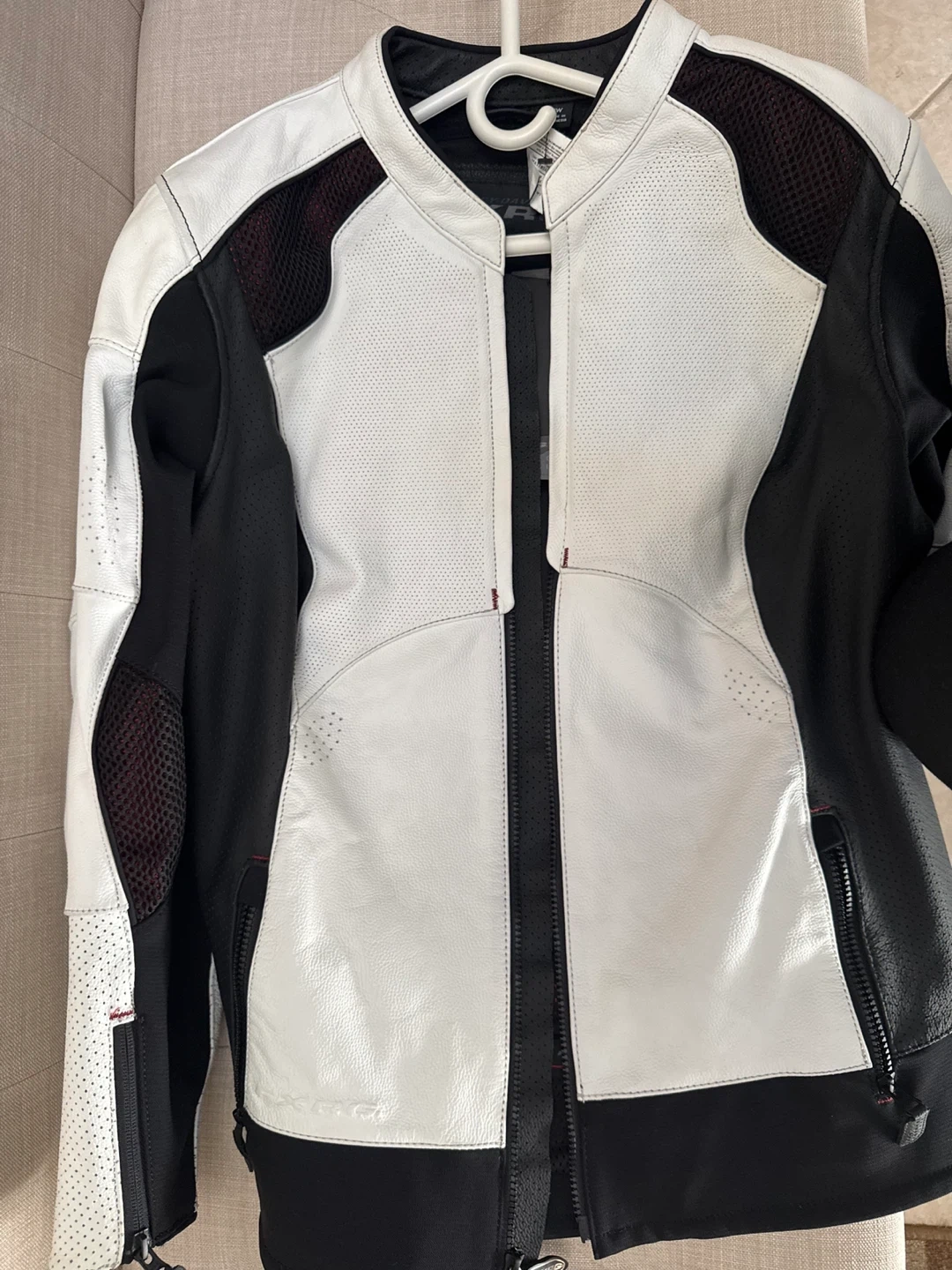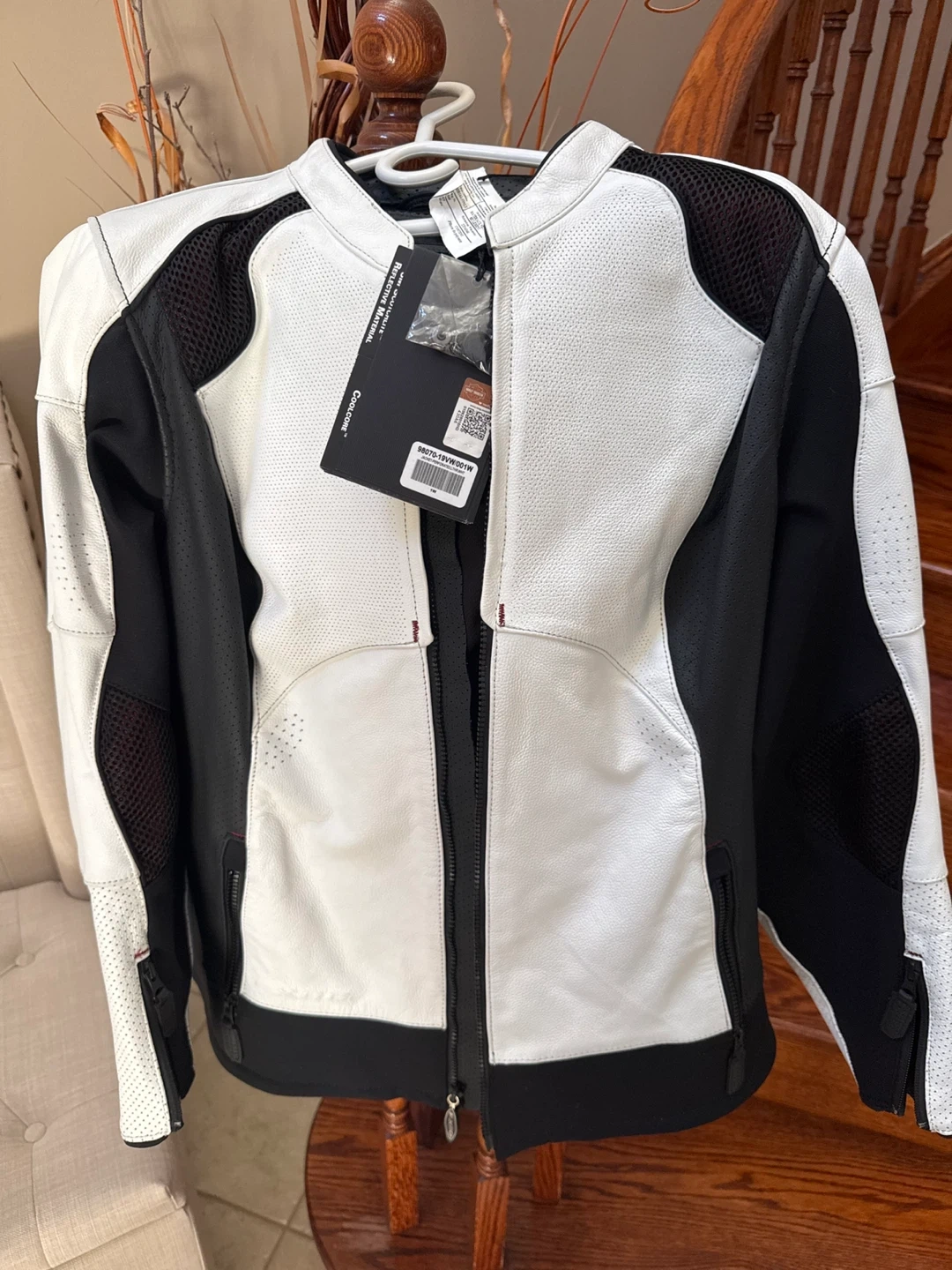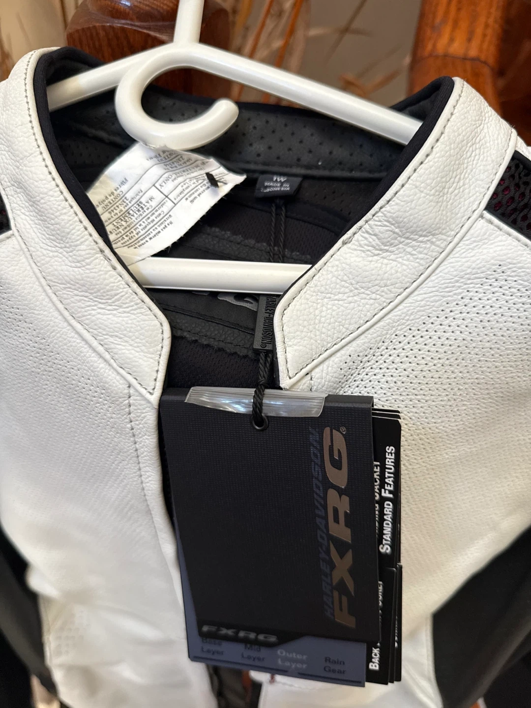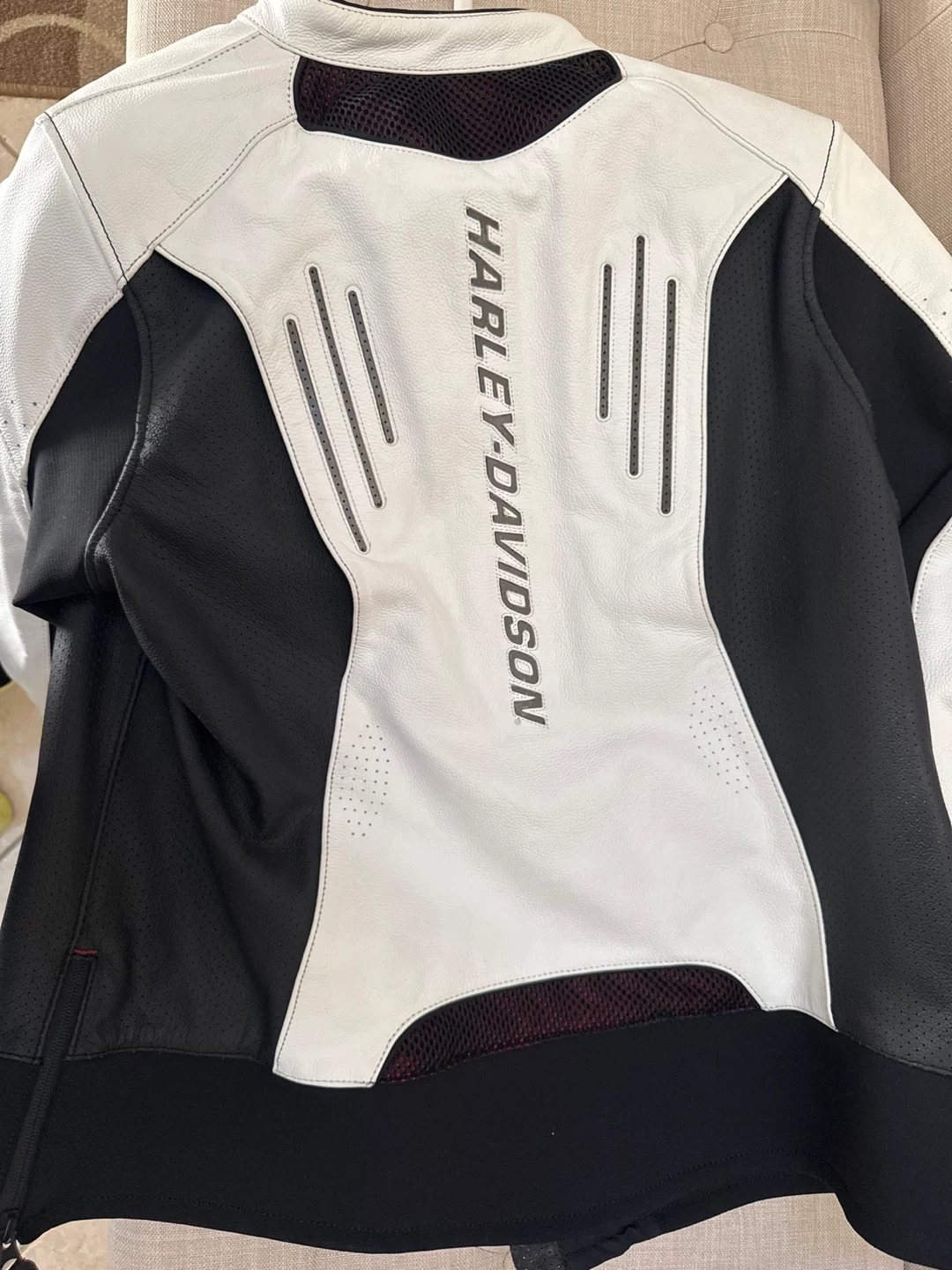 Women's Harley-Davidson FXRG perforated leather motorcycle jacket in white and black. Features mesh panels for ventilation. Includes original tags. Brand New.